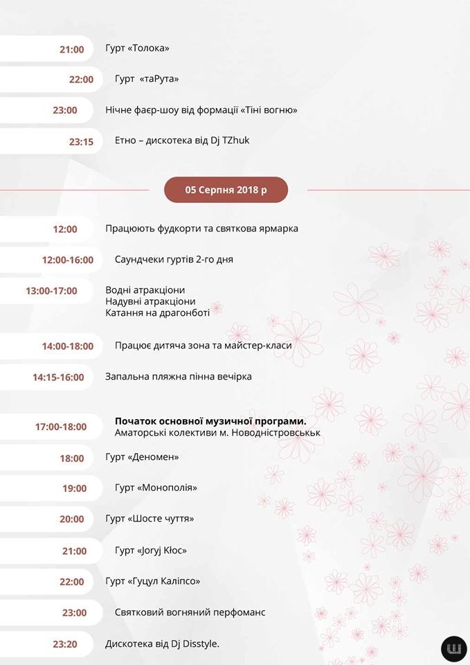 У програмі фестивалю виступи аматорських колективів, етно-колектив «Карпатська Тайстра» та гурти: «Петрос», «Деномен», «Бук», «Монополія», «Шосте чуття», «Толока», «таРута», «Йорі Клоц», «Гуцул Каліпсо», фаєр-шоу формації «Тіні вогню», а ще водні атракціони, пінне паті та катання на драгонботі.