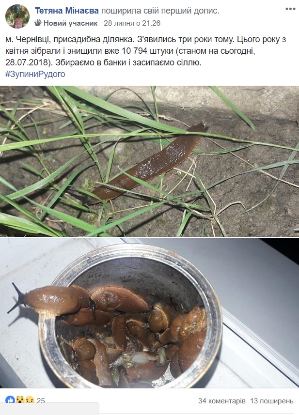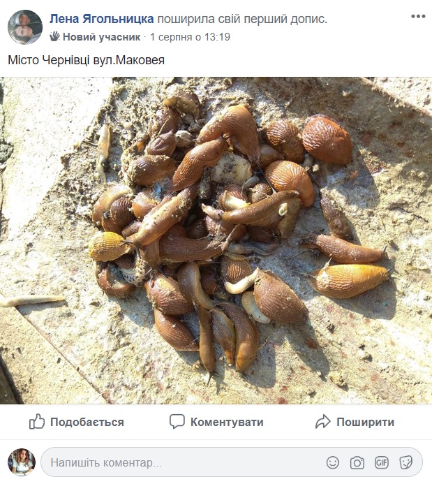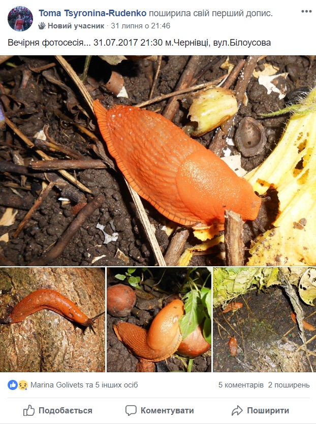 Сотні людей, переважно з західних регіонів, публікують фото рудого іспанського слимака (Arion lusitanicus J), розповідаючи, як він поїдає у них рослини та квіти. Серед таких записів багато повідомлень з Чернівців.