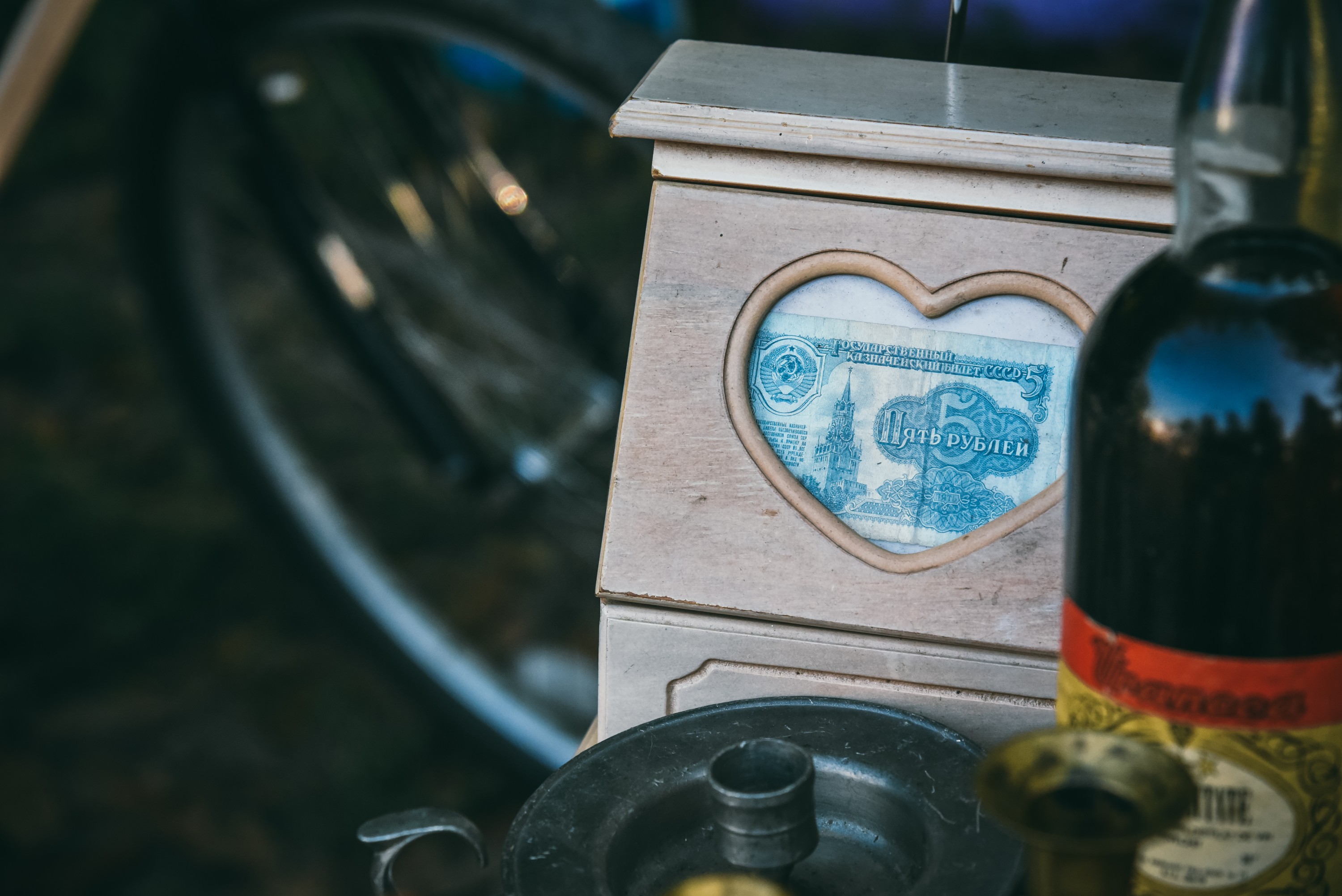 Поспілкувалися із чоловіком та йдемо далі. Бачимо чотирьох людей, які навприсядки курять тютюн і усміхаються. Проходимо повз, адже шукаємо унікальний товар, який суттєво відрізнятиметься від усього, що є на ринку. На столі щось виблискує. Підходимо ближче. Це красивий наручний годинник, окрім нього, тут ще багато цікавих речей. Особливу атмосферу створює пісня «Ягода-малина», що лунає зі старої магнітоли.