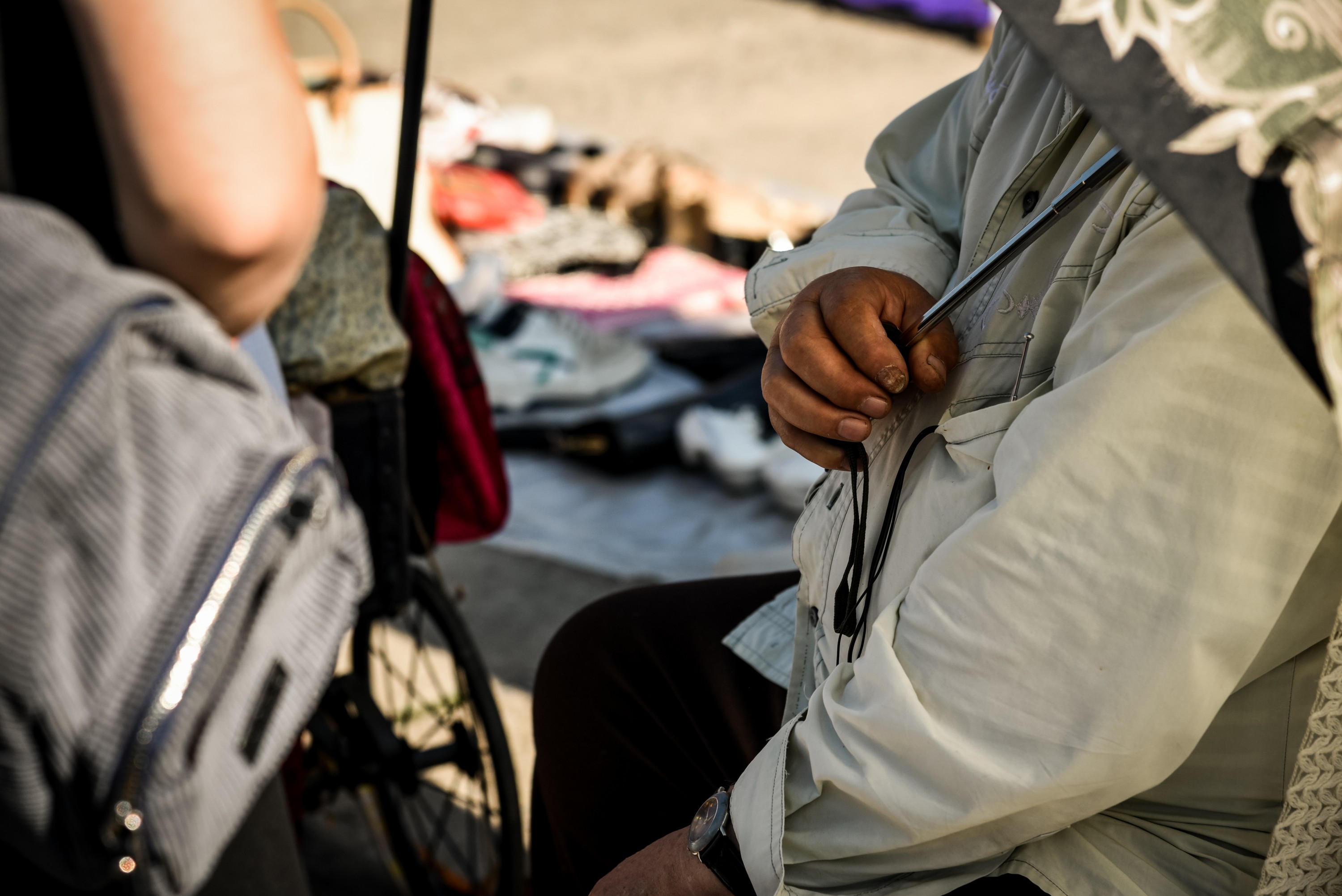 Він не може ходити. Показує нам дитячий візочок і тоді пояснює, для чого він. З однієї сторони він ставить товар, а за іншу – тримається, щоб не впасти, адже дідусеві 82 роки.