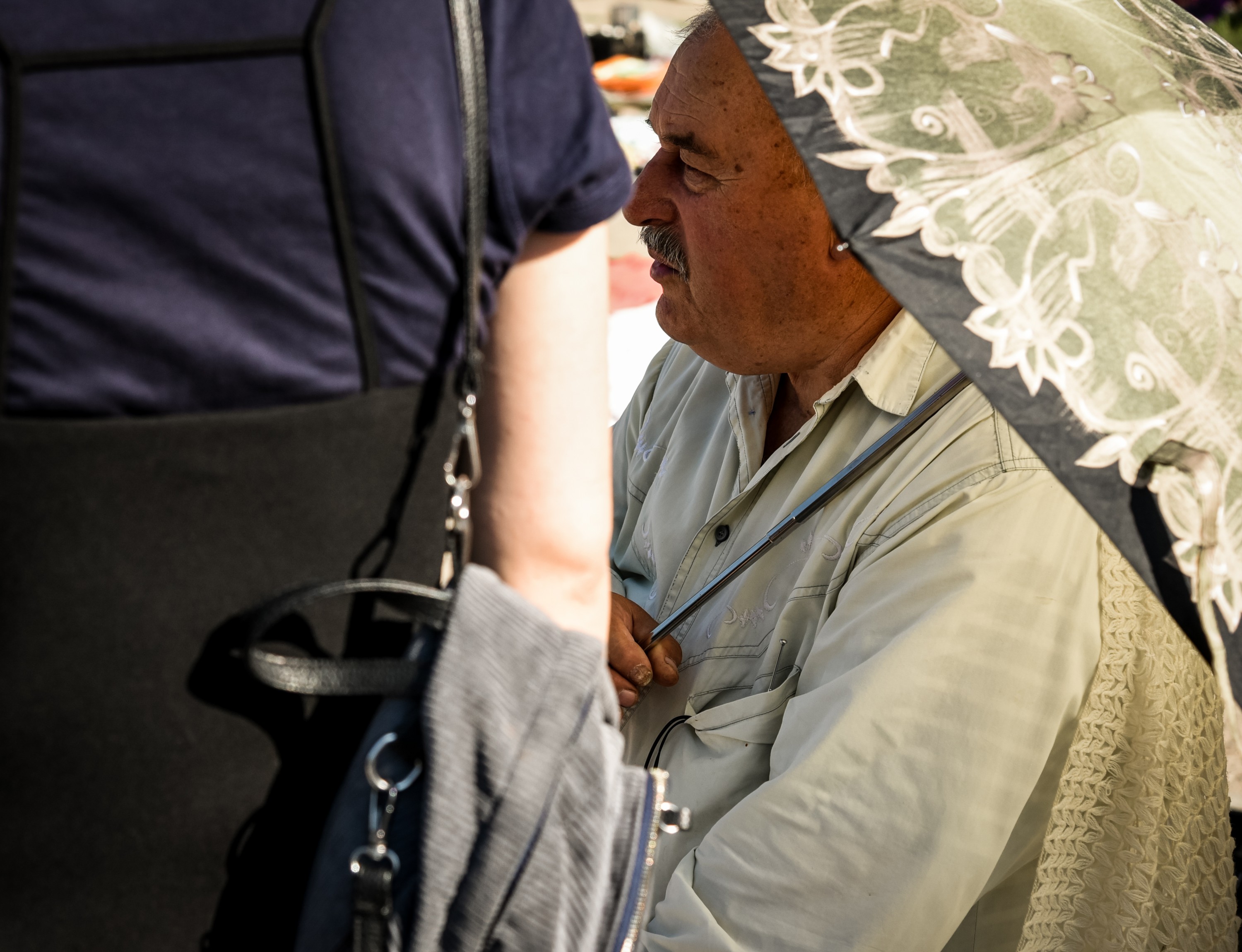 Припікає сонце. На годиннику майже десята, бабусі з дідусями уже розкрили свої парасольки. Запитуємо, чи можна фотографувати та з ким поговорити. Нам рекомендують одного чоловіка.