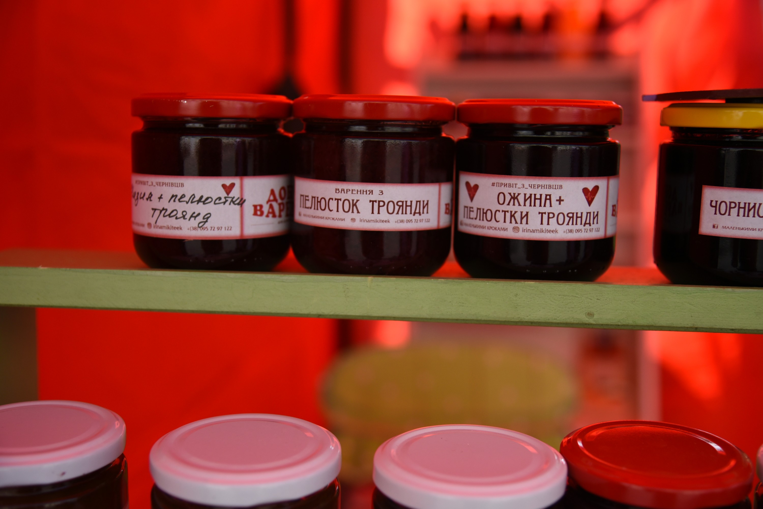 Поруч з наметом Анастасії – стенд, наповнений маленькими баночками домашнього варення на будь-який смак: троянда, чорниця, черешня, полуниця з чилі, лимоном, або базиліком, диня з лимоном, імбирем або апельсином, вишня, кизил.