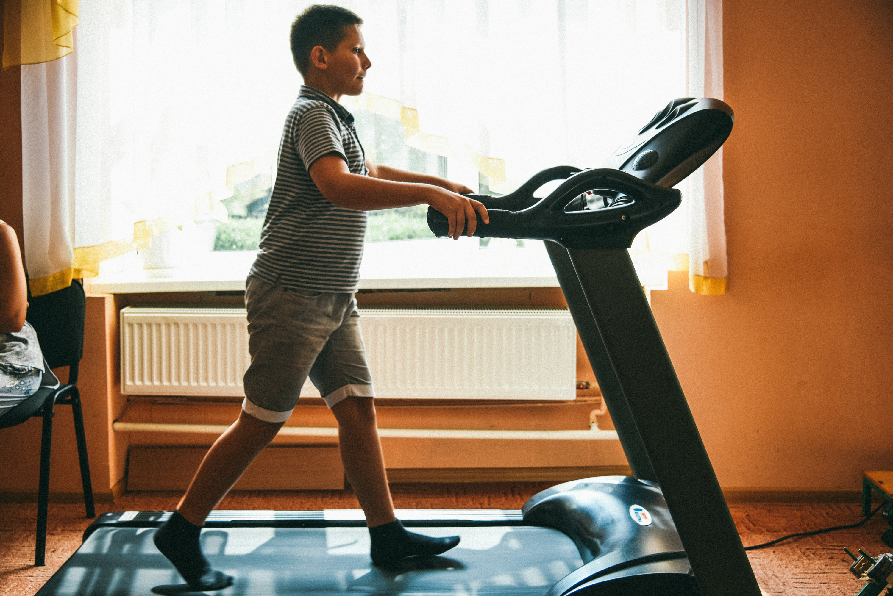 Далі нас проводять до кабінету, де займаються корекцією ходи. Тут проводять індивідуальні вправи від плоскостопості, сколіозу та ін. Також у старому корпусі є ортопед, педіатр та психолог. Окрім цього, у центрі дітки займаються у тренажерному залі. Заходимо туди. Хлопчика наполегливо крутить педалі на спортивному велосипеді.