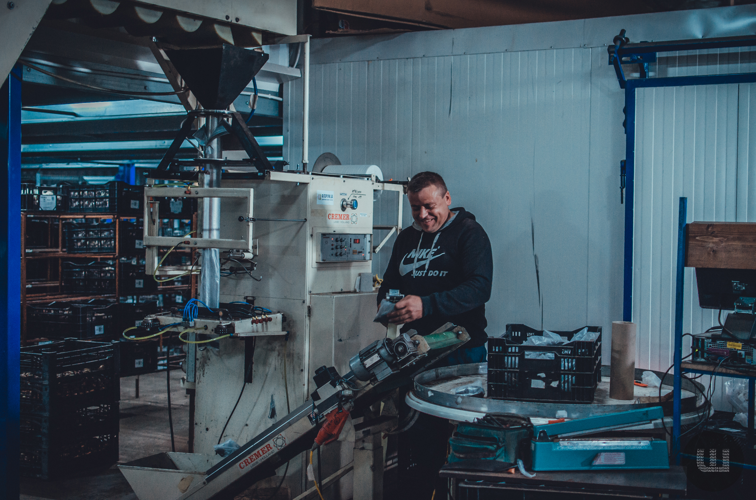 Для швидкого фасування продукції тут закупили пакувальну машину. Їй 20 років, але вона виконує цілий комплекс робіт.