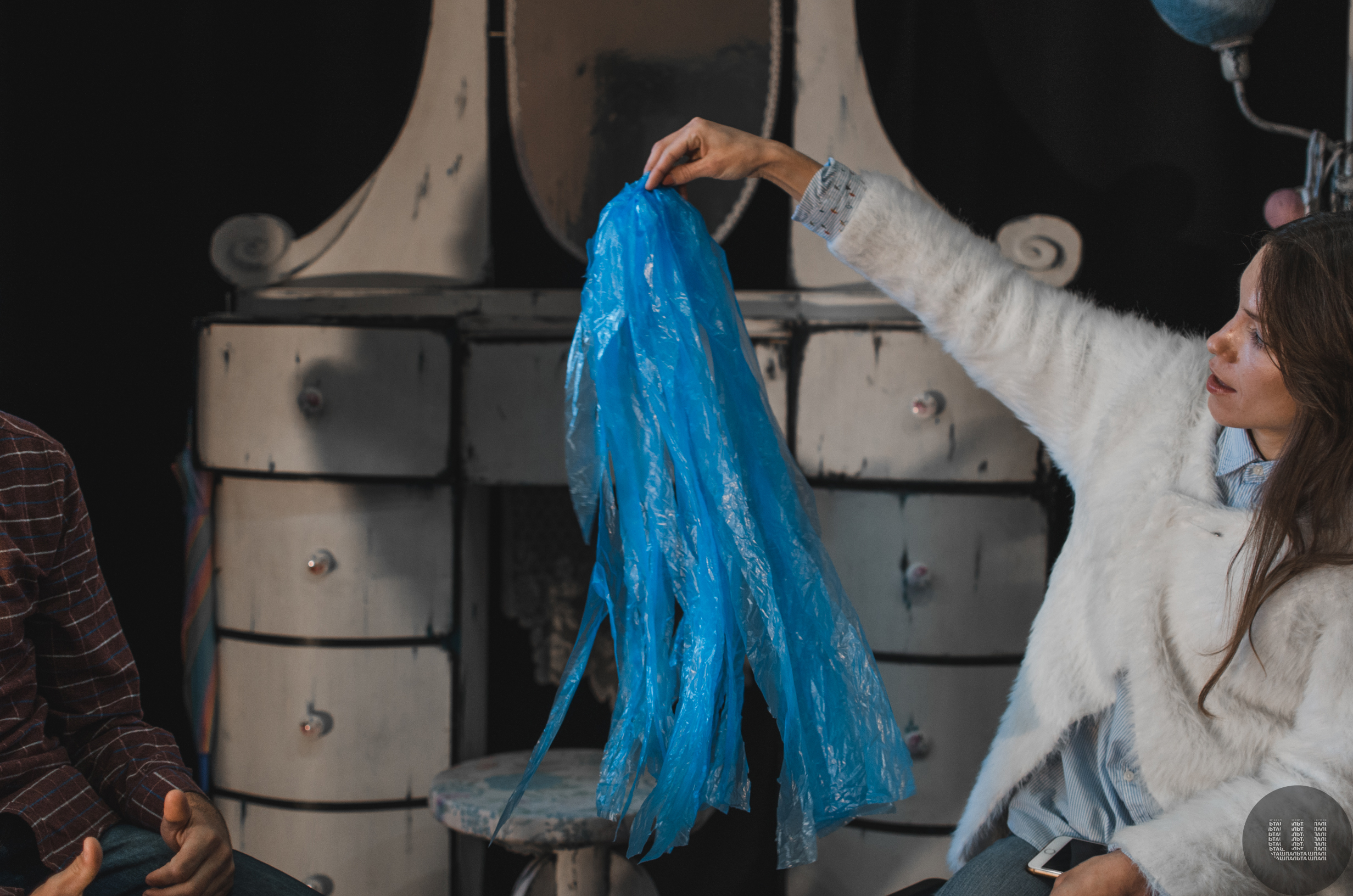 Коли ми проводимо заняття, я беру різні предмети, наприклад, фольгу чи папір і миформуємо тварин, різних фантастичних персонажів. От, наприклад, наша медуза. Таку ляльку можна дуже легко й швидко створити із простого сміттєвого пакета. Ми вмикаємо маленький ліхтарик і вона світиться, а за допомогою рухів ця лялька оживлюється.