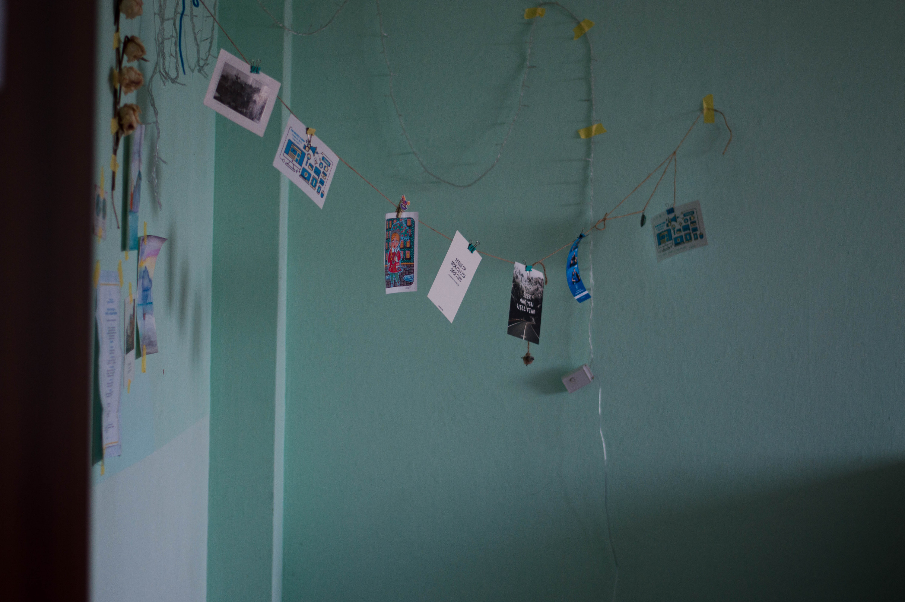 Швидко виходимо – не хочемо заважати. Євгенія проводить нас на п`ятий поверх – житловий. Дорогою вказує на прапорці між перилами та розповідає: «До канікул у нас тут була вечірка – «СходИ на схОди». Знаєте, тут студенти встелили все пуфами, накрили якимись речами, почепили ліхтарики, зробили чай зі смаколиками. Також навели на стелю проектор зоряного неба – отакий був творчий вечір. Ми співали, читали вірші. Взагалі творчі вечори в нас готують самі студенти. От скоро має бути «Вечірка на матрацах».