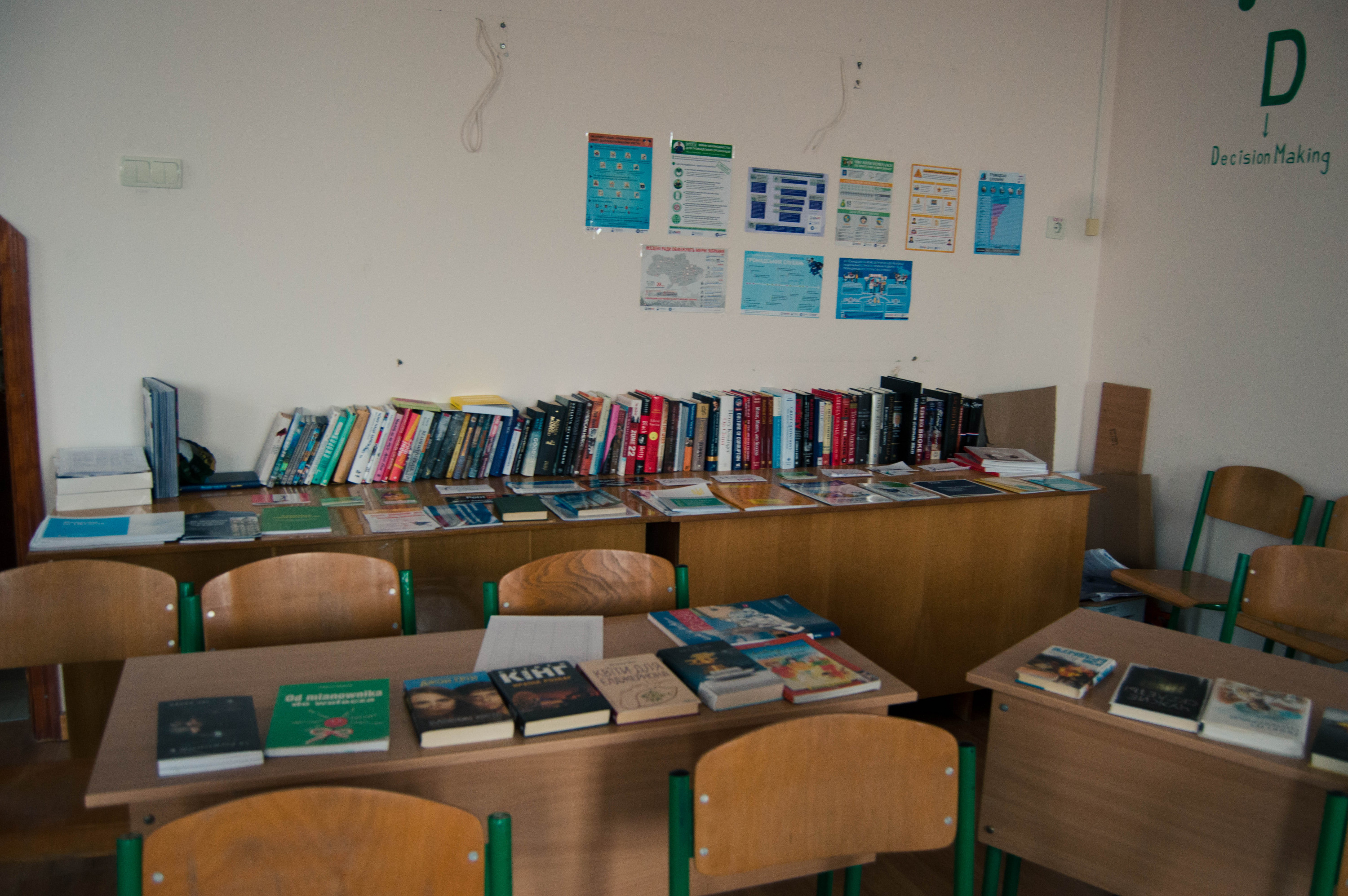 Заходимо в іншу кімнату. Тут також зосереджені студенти сидять та щось записують – знову заняття з англійської, але вже іншого рівня підготовки. Як розповідає Євгенія, усіх УАЛівців ділять на групи, відповідно до знання іноземної. Це допомагає краще сконцентруватися та приділити увагу найважливішим аспектам вивчення мови. Звертаю увагу на полиці, заставлені книгами авторів-сучасників.