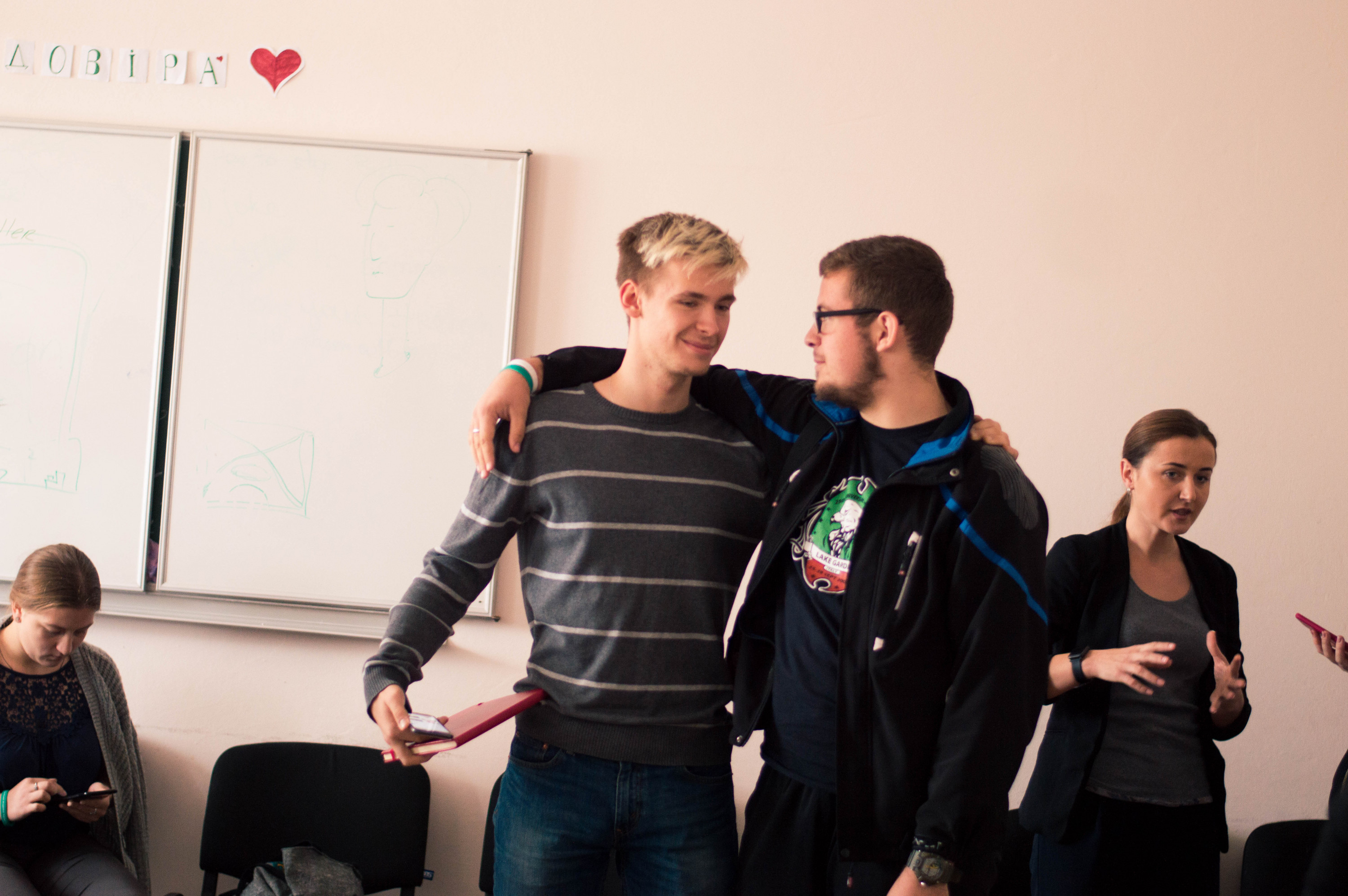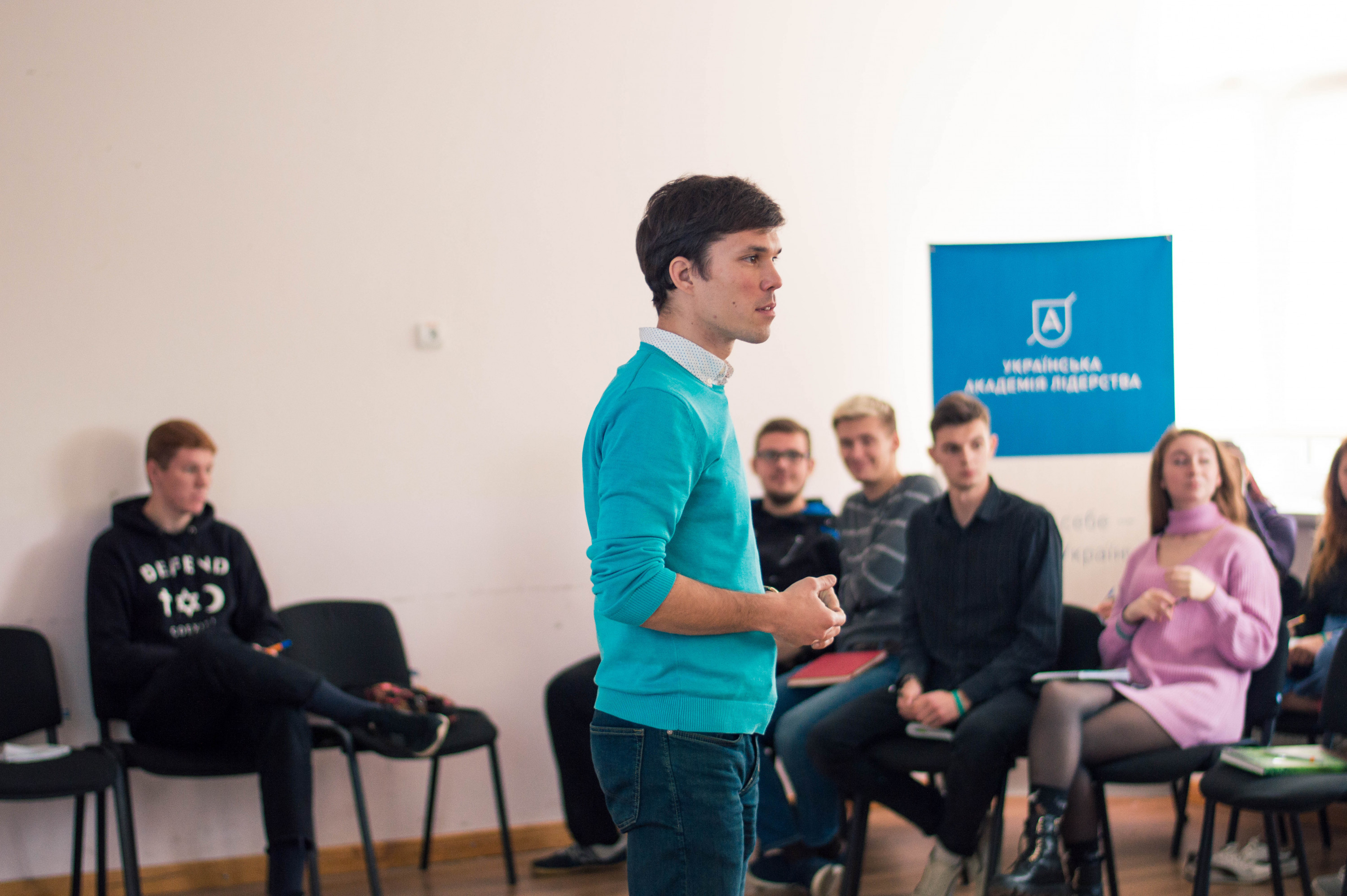 Якась дівчина кричить на увесь коридор: «Одна хвилина-а-а-а». На УАЛівців чекає блок лекцій з фандрейзингу. Студентів навчатимуть переконувати інших в успішності своїх проектів. Вони уже зайняли місця в аудиторії і чекають національного спікера. А ми спостерігаємо. Можливо, серед них є майбутні міжнародні юристи чи популярні дизайнери, депутати чи президенти. Та усі точно стануть «змінотворцями» – тими, хто, змінивши себе, змінить Україну.