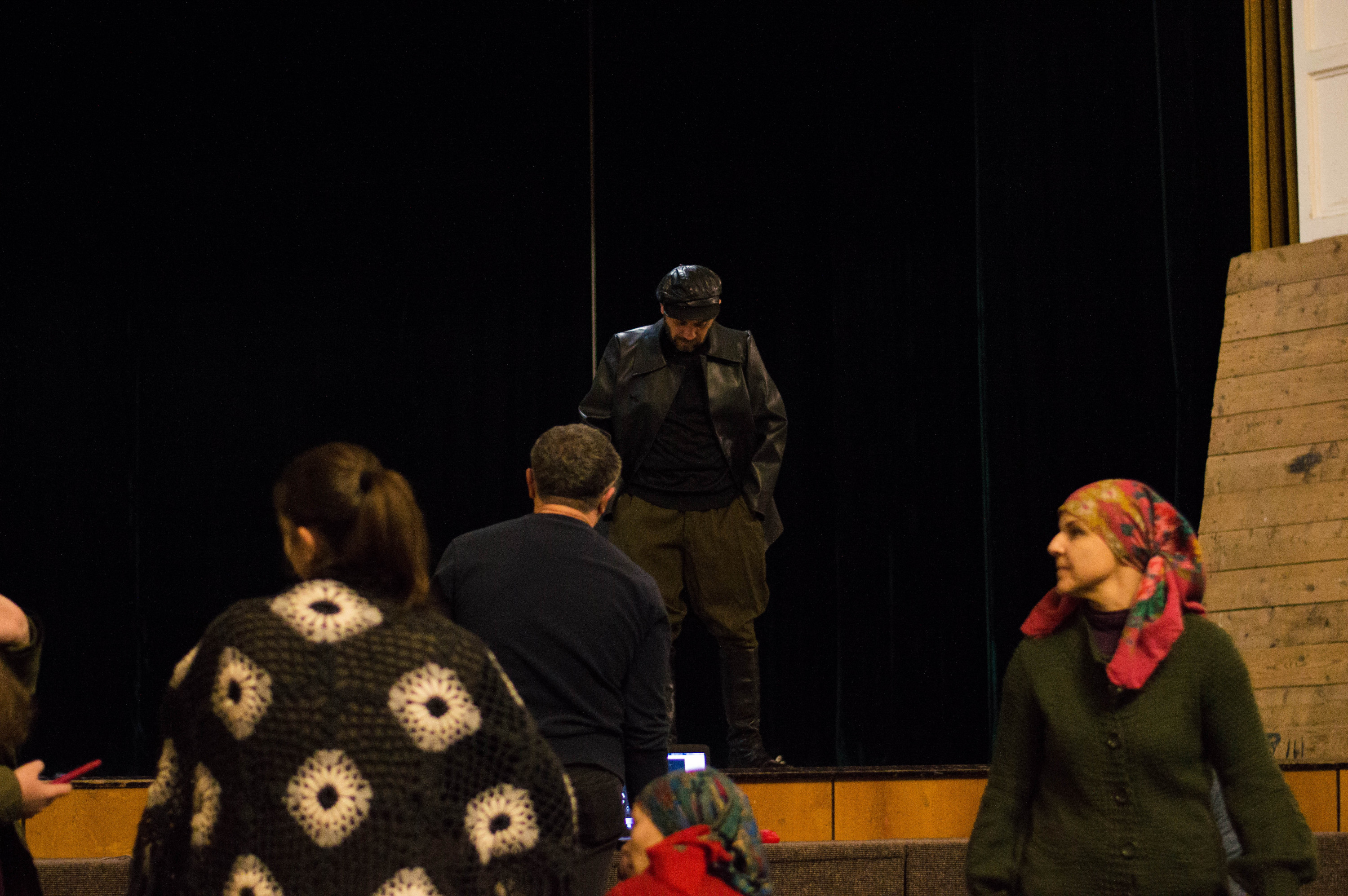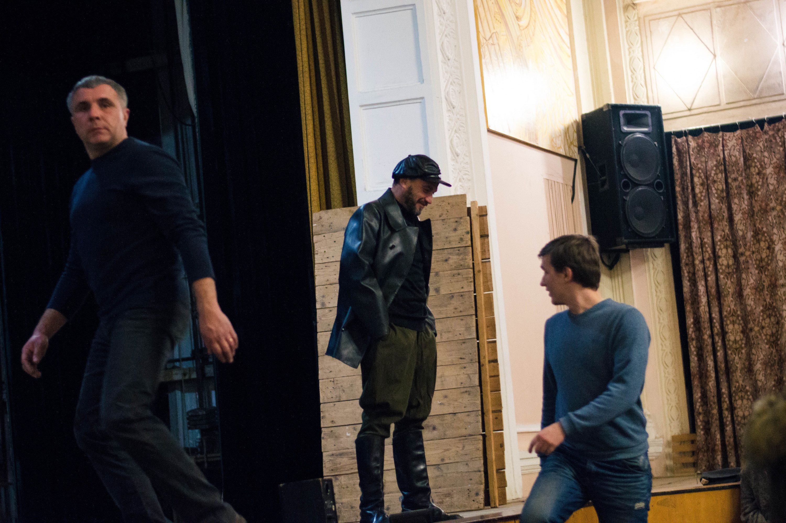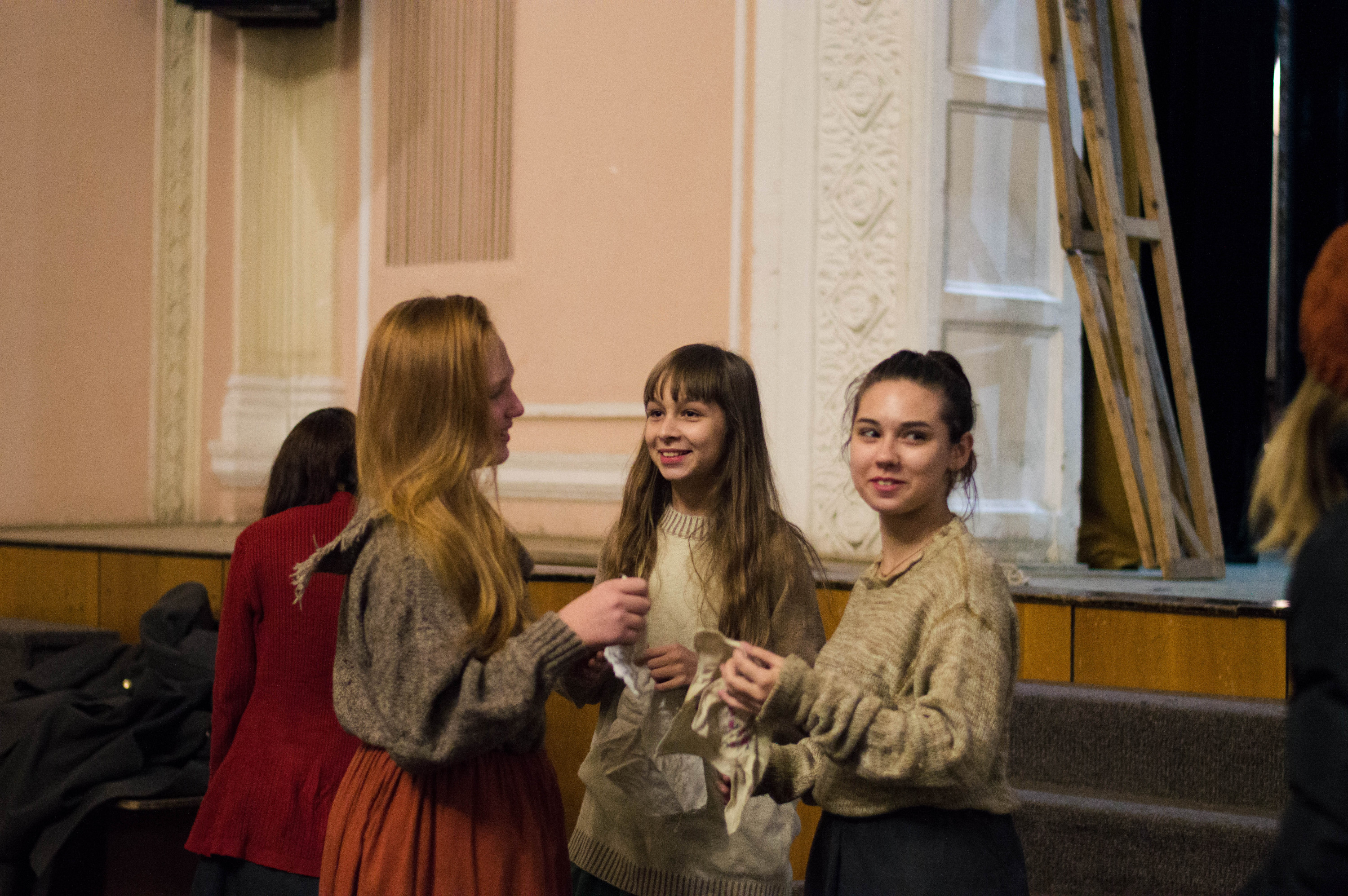 Заходжу до залу, людей поки що небагато. Підходжу до групи дівчат років тринадцяти, знайомлюся. Виявляється, вони не з аматорського театру, а з дитячої студії «Бу-бу-бу», якою теж опікується Іван Данілін. Як пояснюють дівчата, загалом у виставі зібралися актори Народного драматичного театру, дитячої студії та театру «Темп». Юля розповідає, що їхній керівник Іван Вікторович ось-ось буде – пішов до Філармонії за декораціями, а вони тим часом готуються.