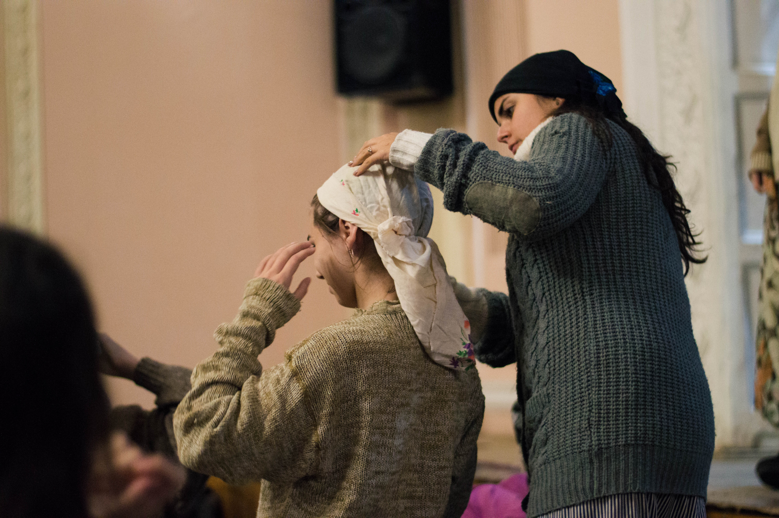 –Подивися, так носили тоді? – запитує одна з дівчат, натягуючи хустину на потилицю.