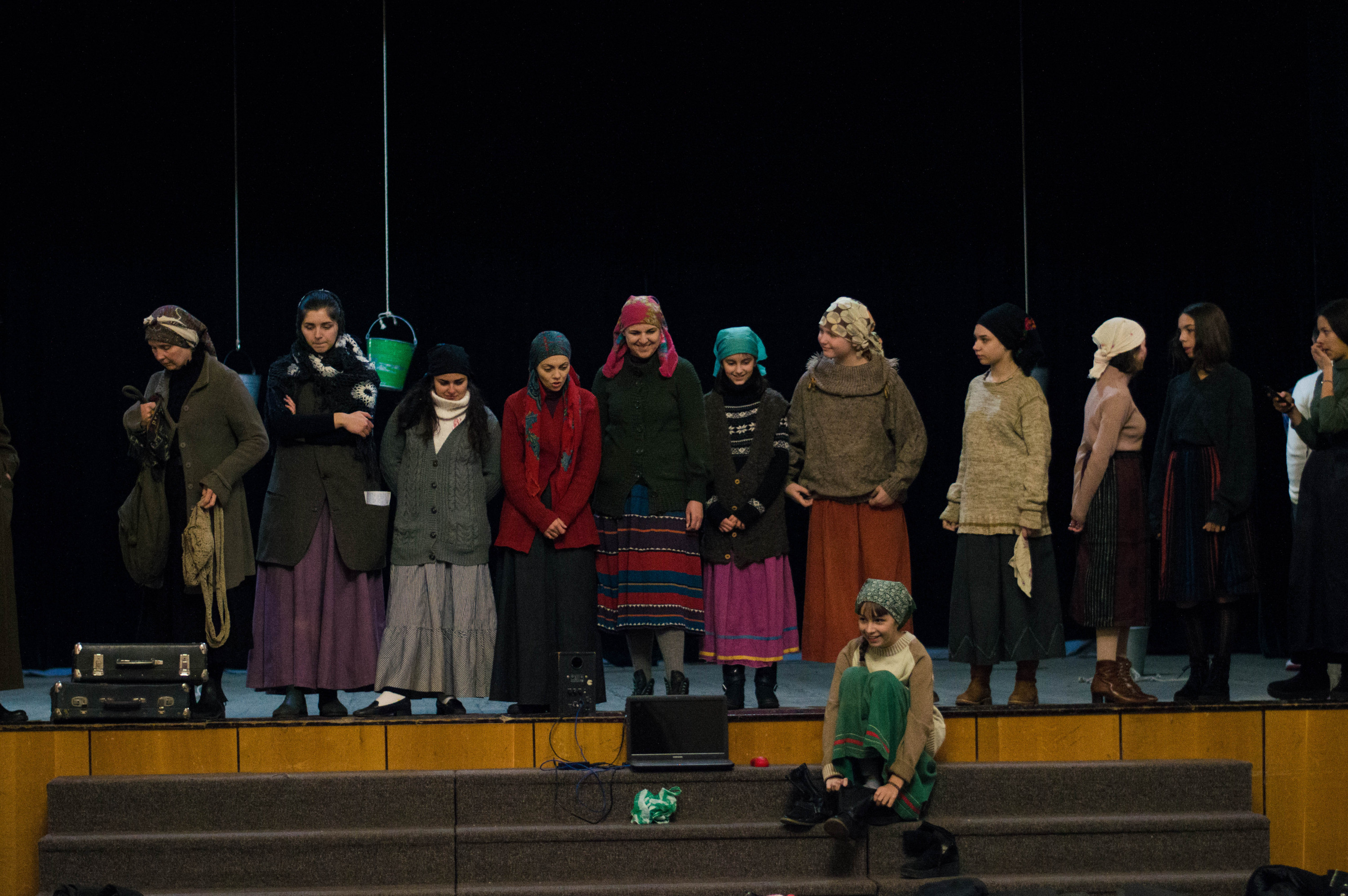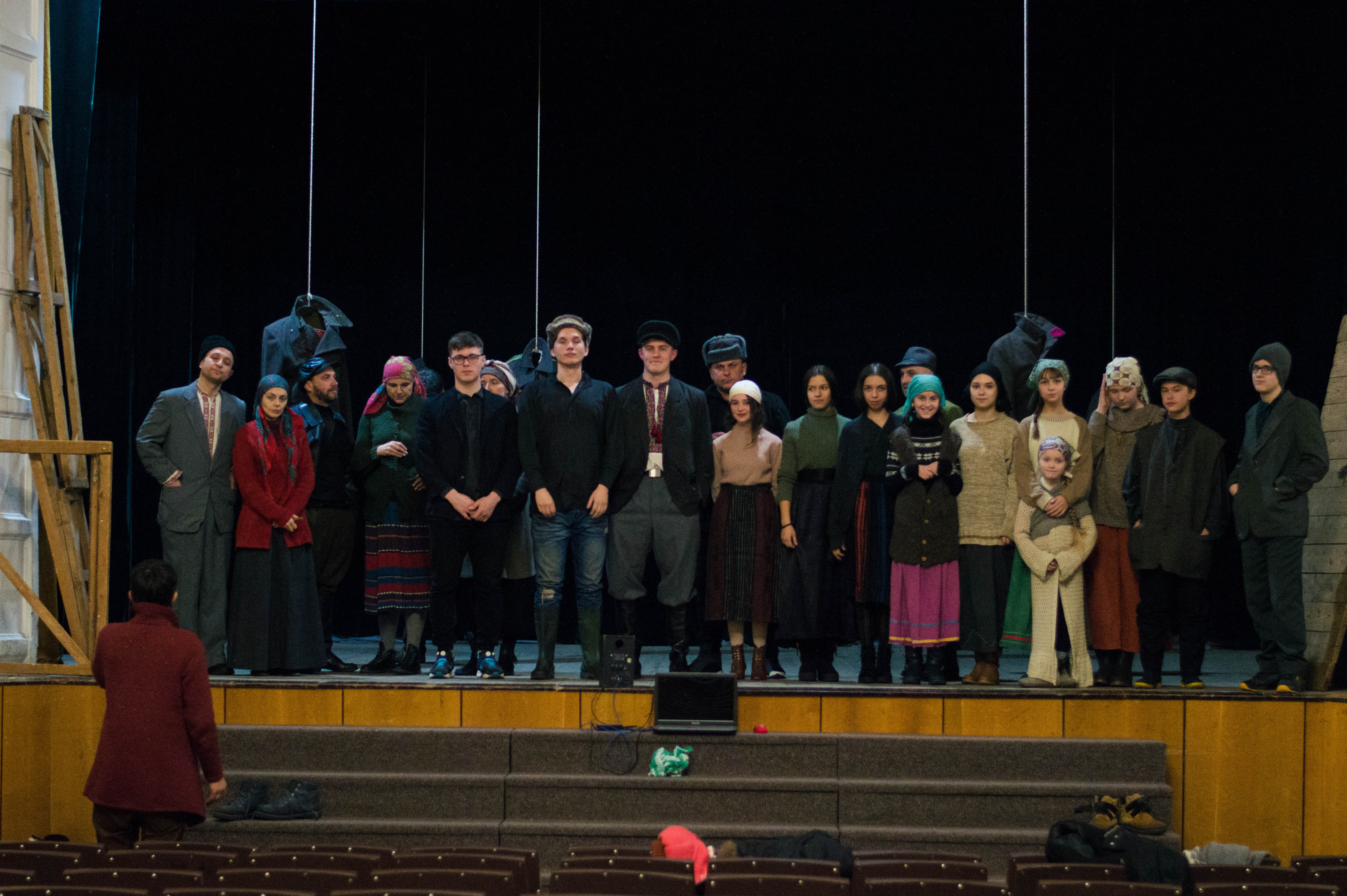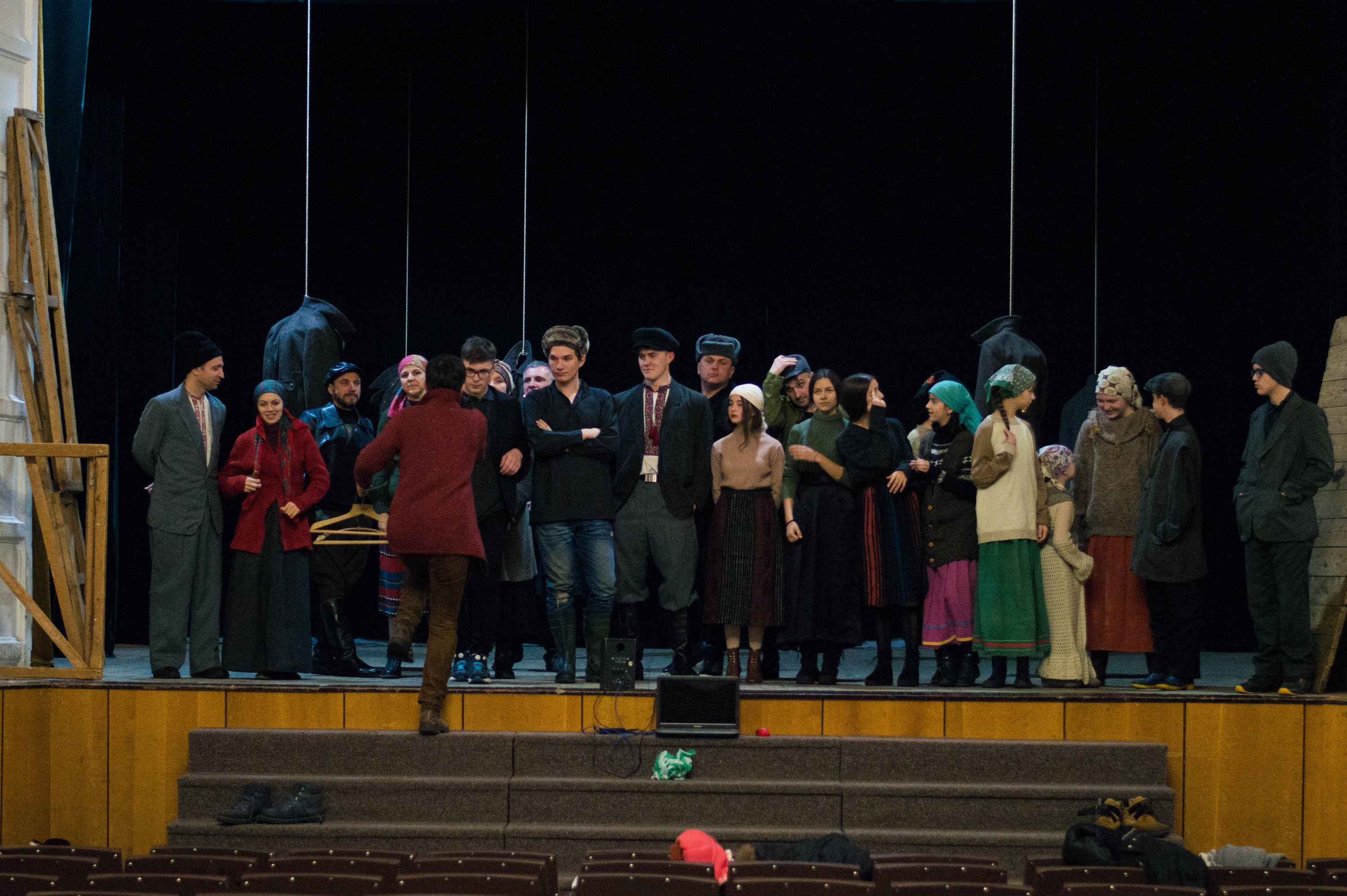 Декорації складені, Іван Данілін кличе всіх хлопців на сцену – перевіряє відповідність костюмів. І я, користуючись можливістю, підходжу до дівочого кола. Знайомлюся з Іриною – актрисою Народного драматичного театру.