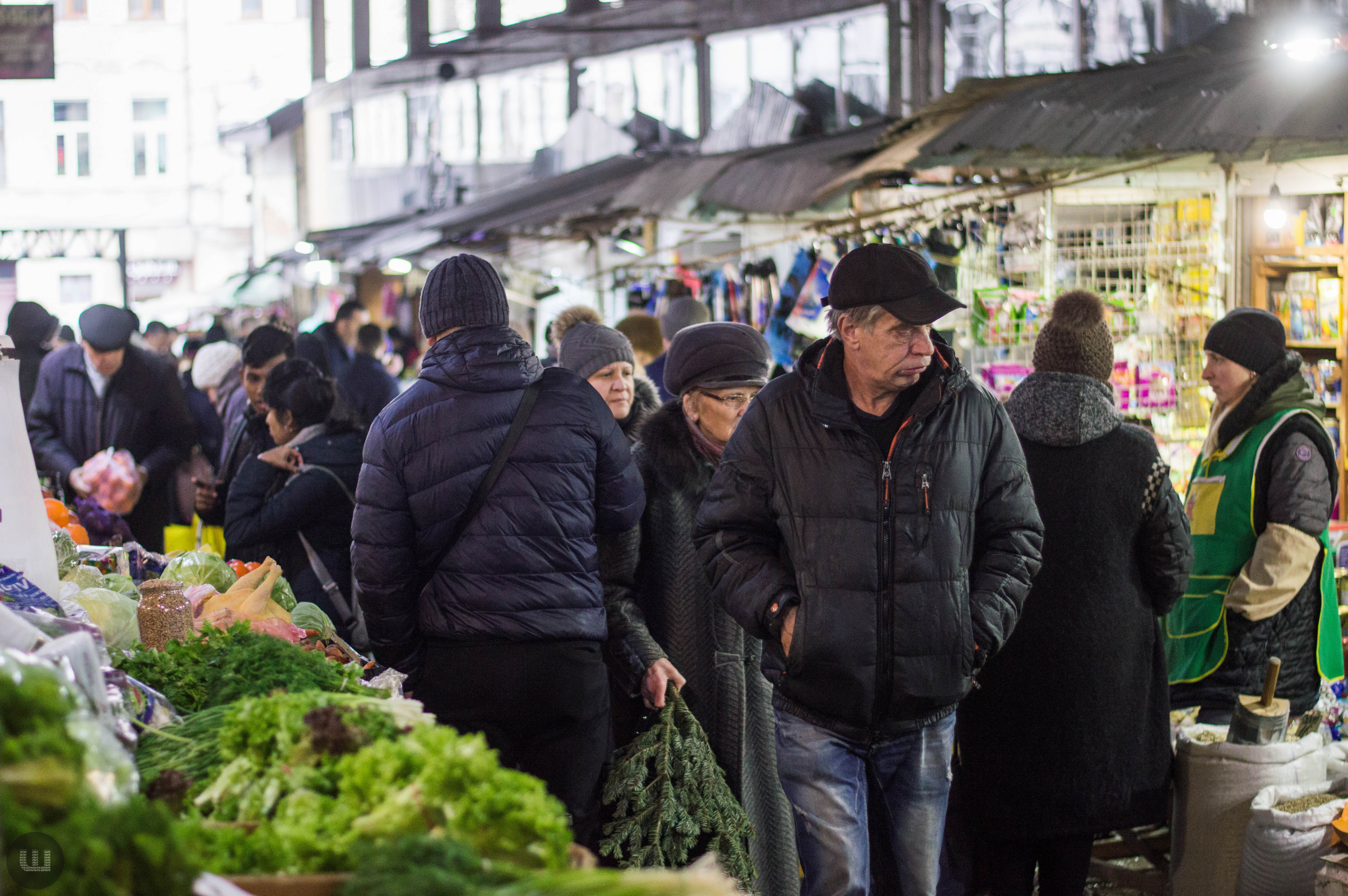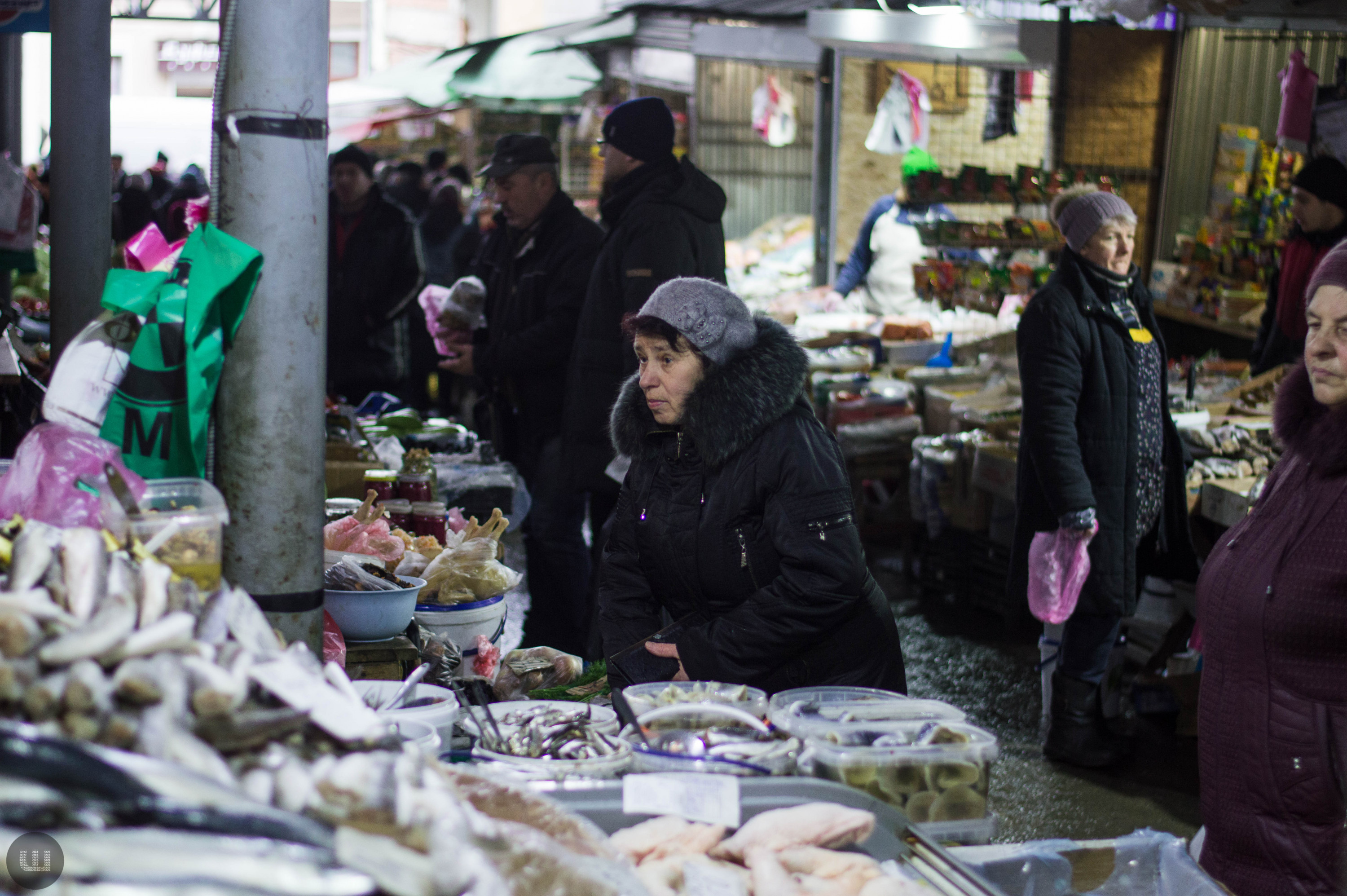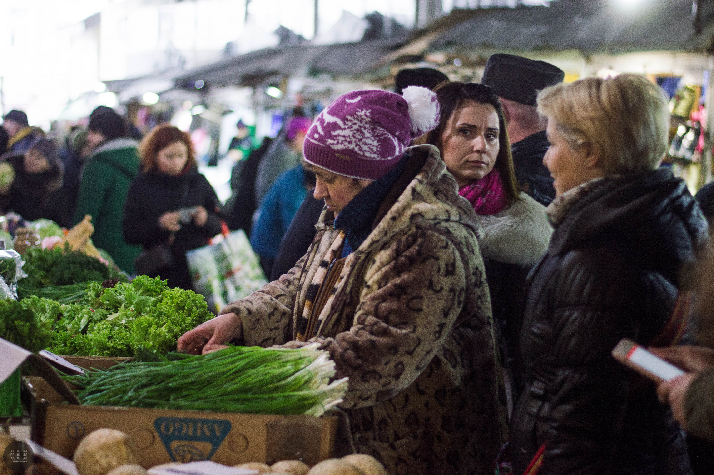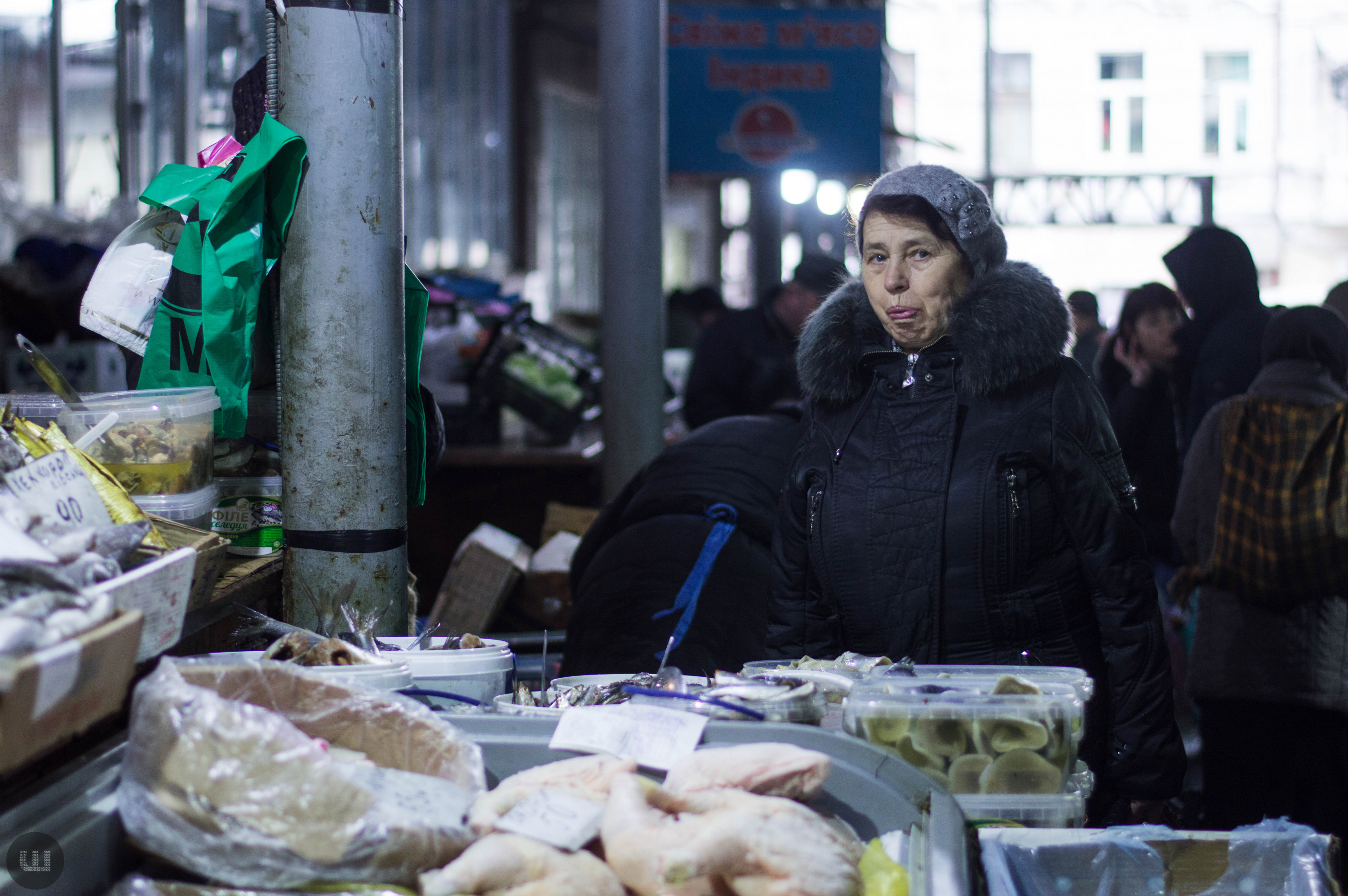 Післяобіддя п’ятниці, 28 грудня. Зранку на вулицях було безліч людей із гілками хвої та пакунками ялинкових прикрас. А зараз центр, здається, завмер – навколо болотисто-сіро й тихо. Але це точно не стосується Центрального ринку міста, куди я прямую з пані Тетяною на новорічні закупи. Жінка дуже відповідально ставиться до новорічних свят, адже це – привід зібрати всю сім’ю разом за столом. Навіть сини, які навчаються в Києві та служать в армії, можуть приїхати. Дорогою каже, що на ринку вже не була багато років – зазвичай скуповується у великих гіпермаркетах. Підходимо до центрального входу. Серед натовпу покупців ледь-ледь видно прилавки. Йдемо вздовж рядом.