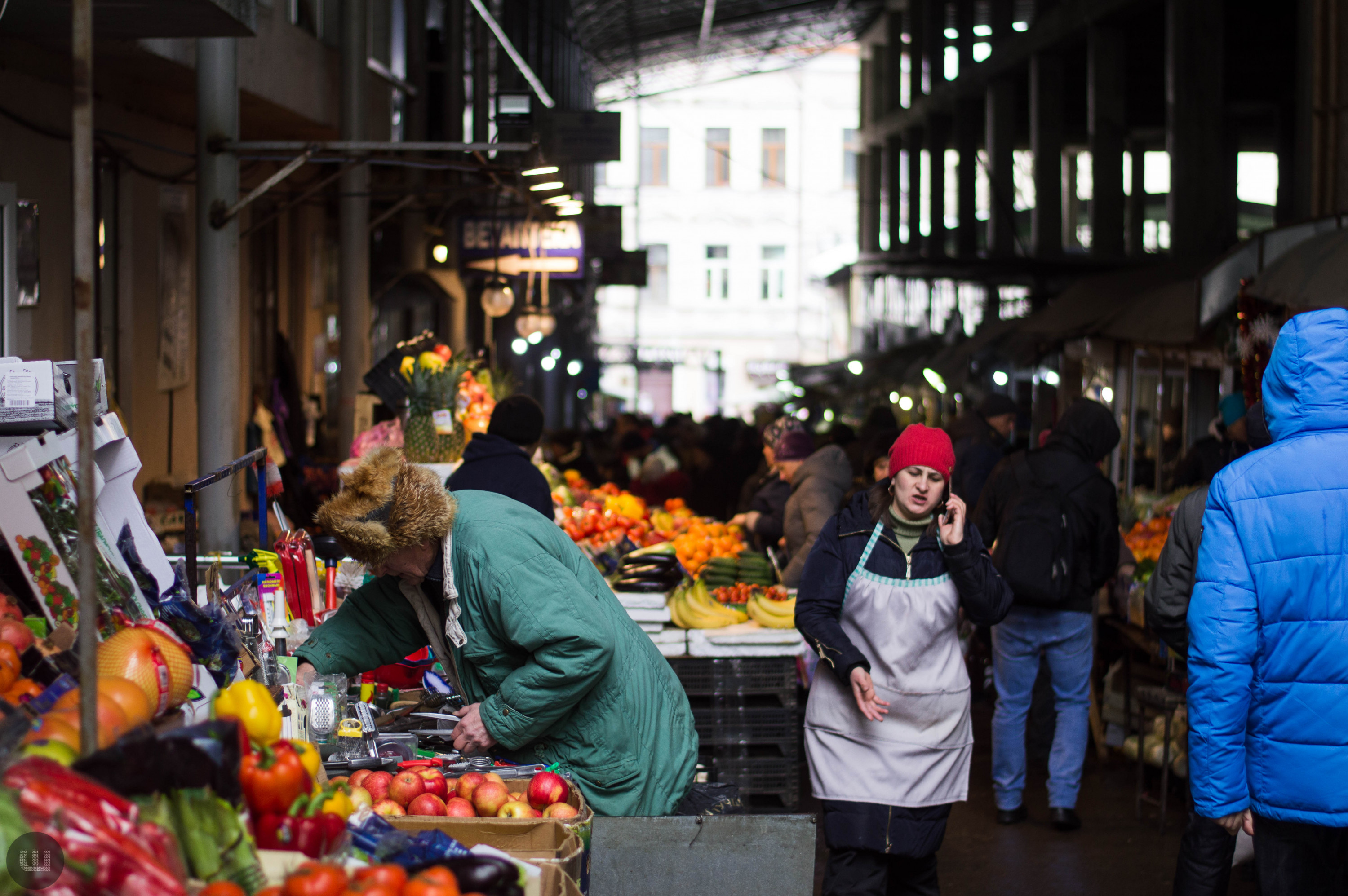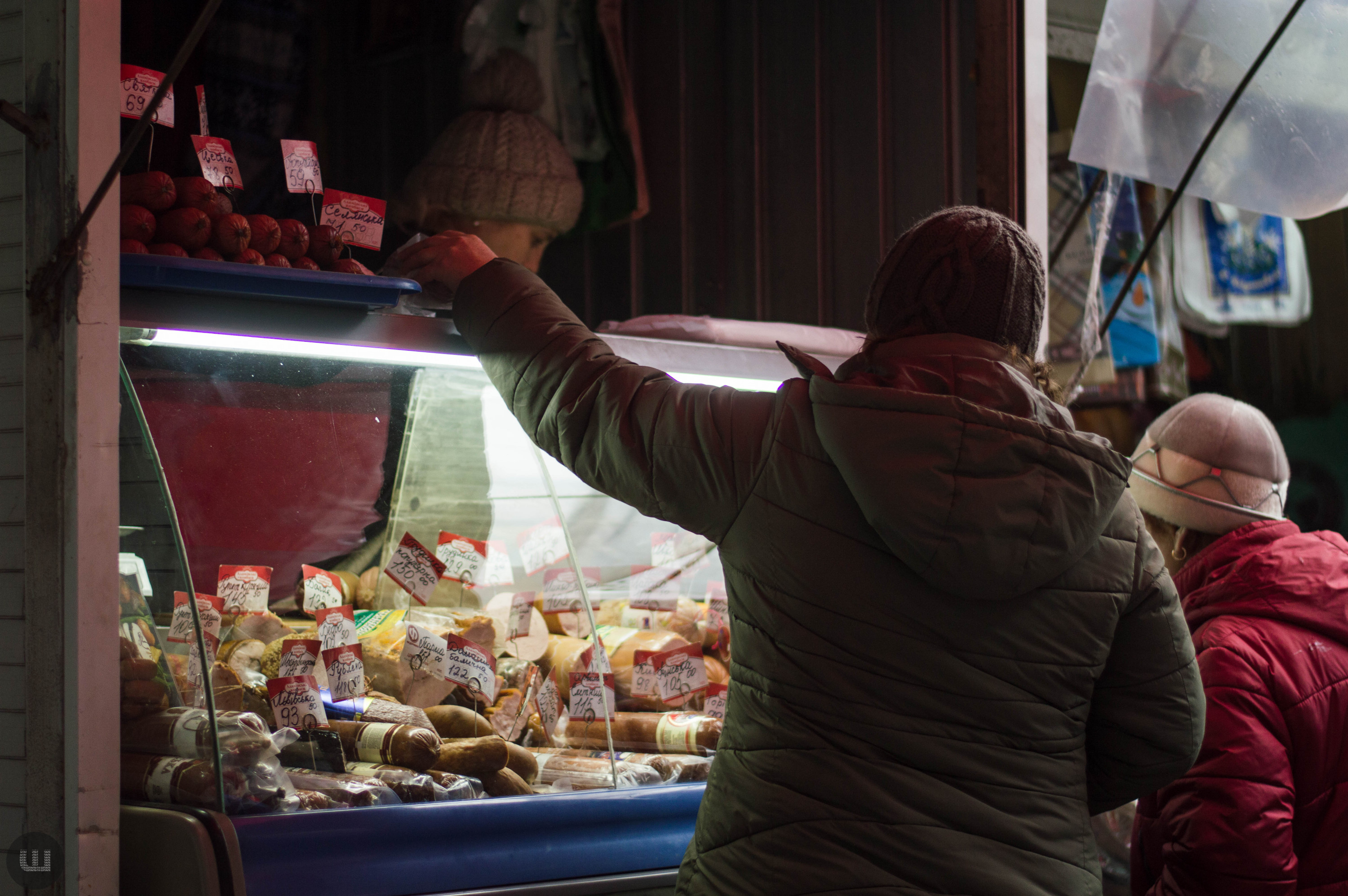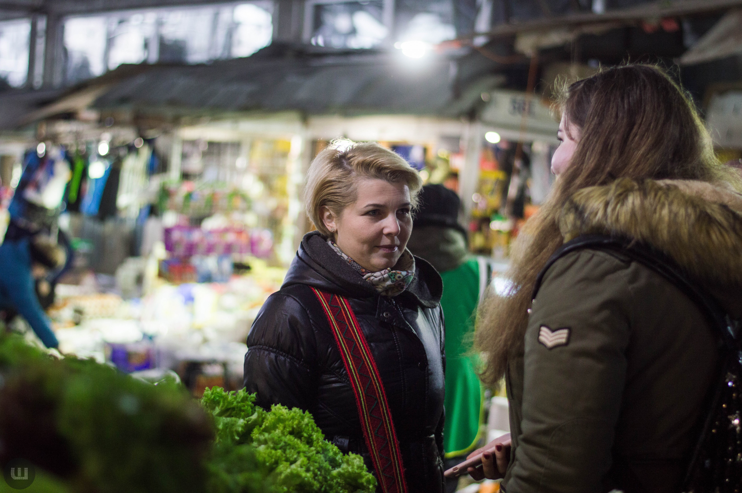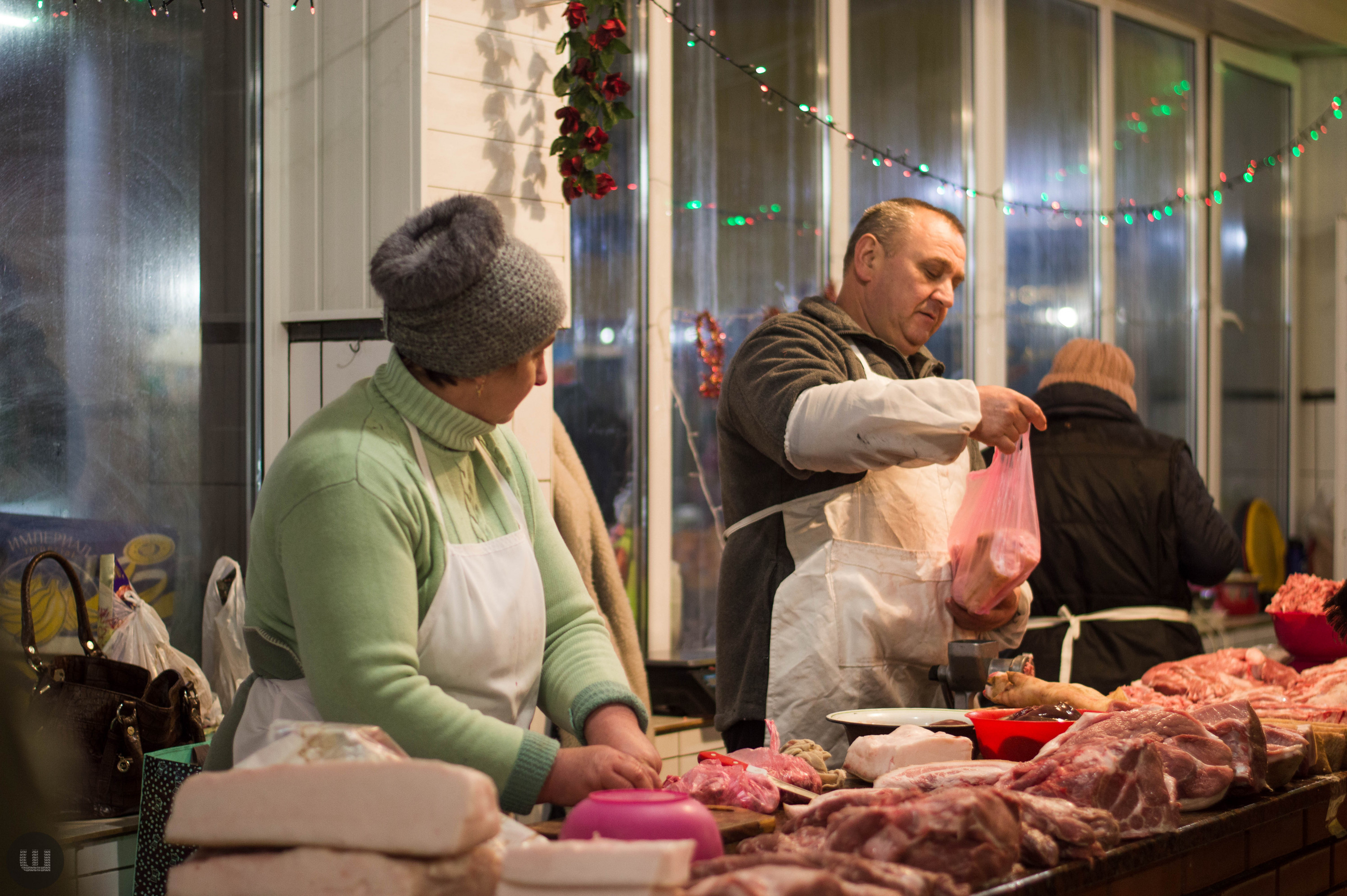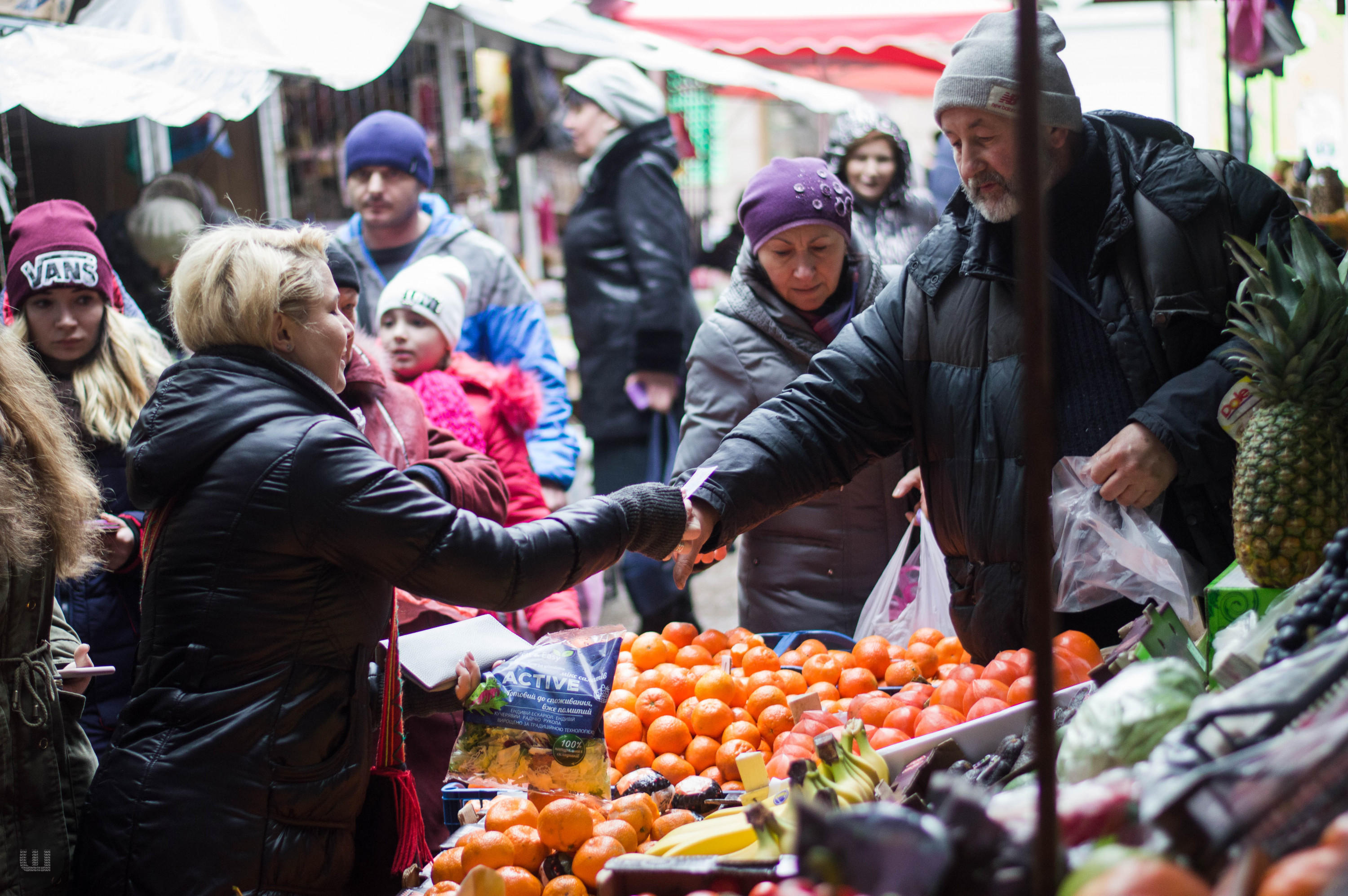 Післяобіддя п’ятниці, 28 грудня. Зранку на вулицях було безліч людей із гілками хвої та пакунками ялинкових прикрас. А зараз центр, здається, завмер – навколо болотисто-сіро й тихо. Але це точно не стосується Центрального ринку міста, куди я прямую з пані Тетяною на новорічні закупи. Жінка дуже відповідально ставиться до новорічних свят, адже це – привід зібрати всю сім’ю разом за столом. Навіть сини, які навчаються в Києві та служать в армії, можуть приїхати. Дорогою каже, що на ринку вже не була багато років – зазвичай скуповується у великих гіпермаркетах. Підходимо до центрального входу. Серед натовпу покупців ледь-ледь видно прилавки. Йдемо вздовж рядом.