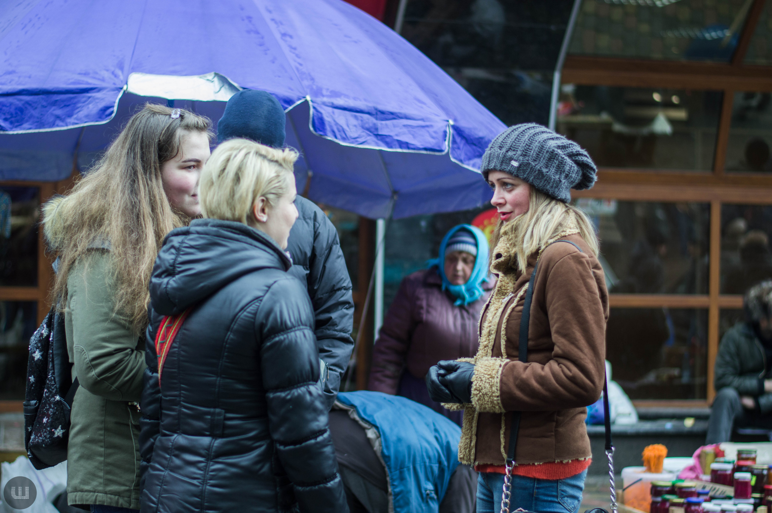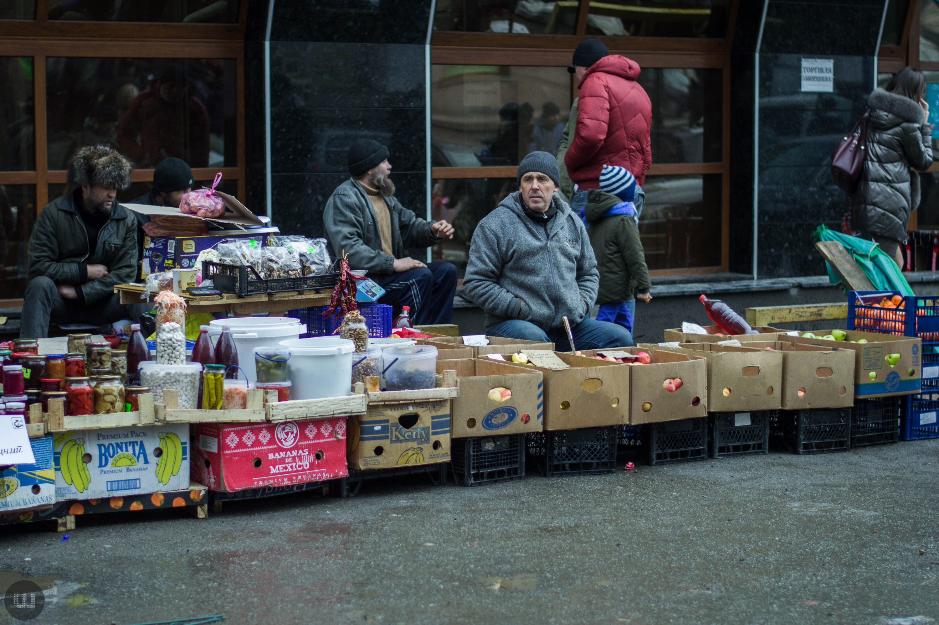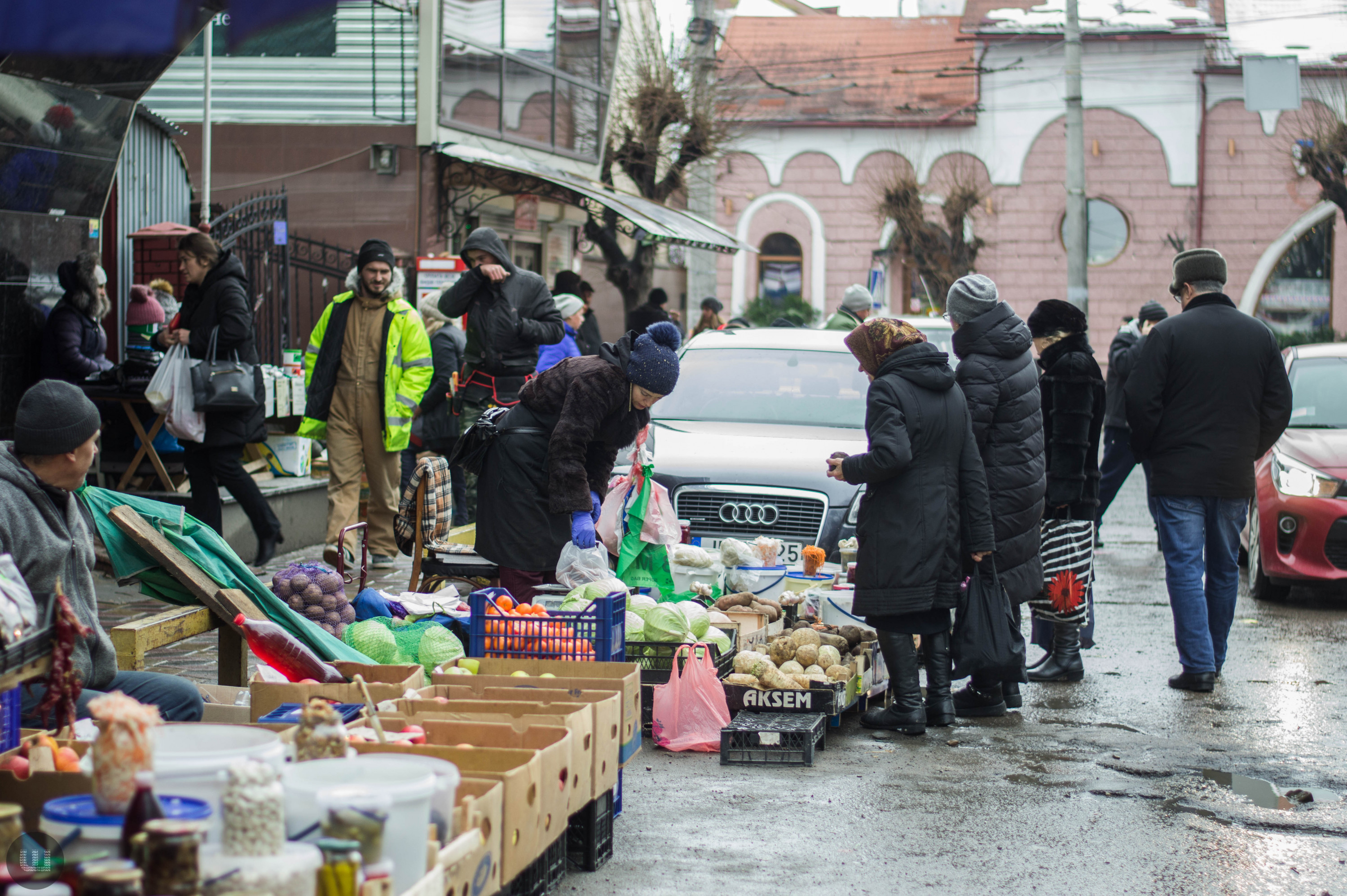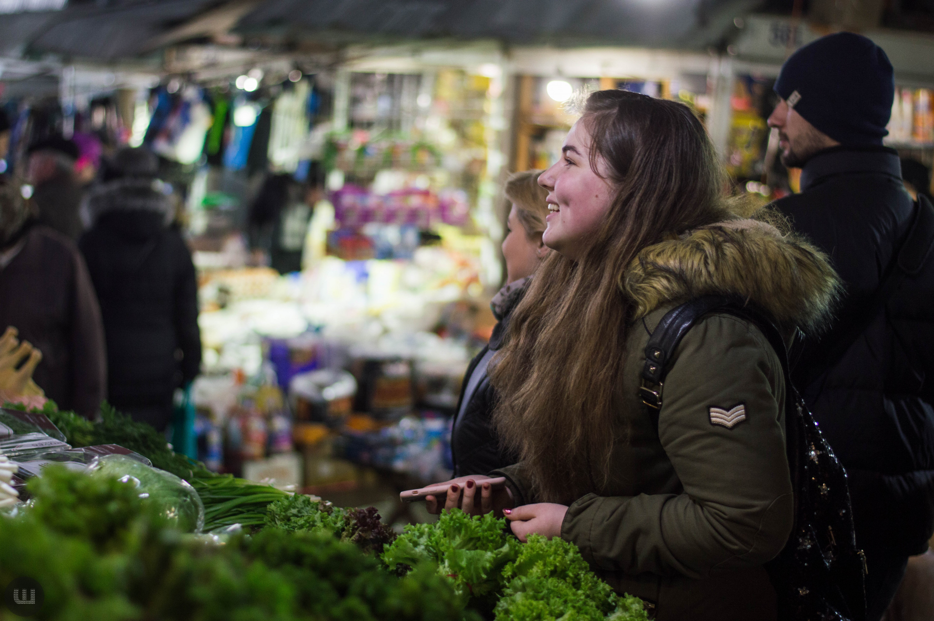 Післяобіддя п’ятниці, 28 грудня. Зранку на вулицях було безліч людей із гілками хвої та пакунками ялинкових прикрас. А зараз центр, здається, завмер – навколо болотисто-сіро й тихо. Але це точно не стосується Центрального ринку міста, куди я прямую з пані Тетяною на новорічні закупи. Жінка дуже відповідально ставиться до новорічних свят, адже це – привід зібрати всю сім’ю разом за столом. Навіть сини, які навчаються в Києві та служать в армії, можуть приїхати. Дорогою каже, що на ринку вже не була багато років – зазвичай скуповується у великих гіпермаркетах. Підходимо до центрального входу. Серед натовпу покупців ледь-ледь видно прилавки. Йдемо вздовж рядом.