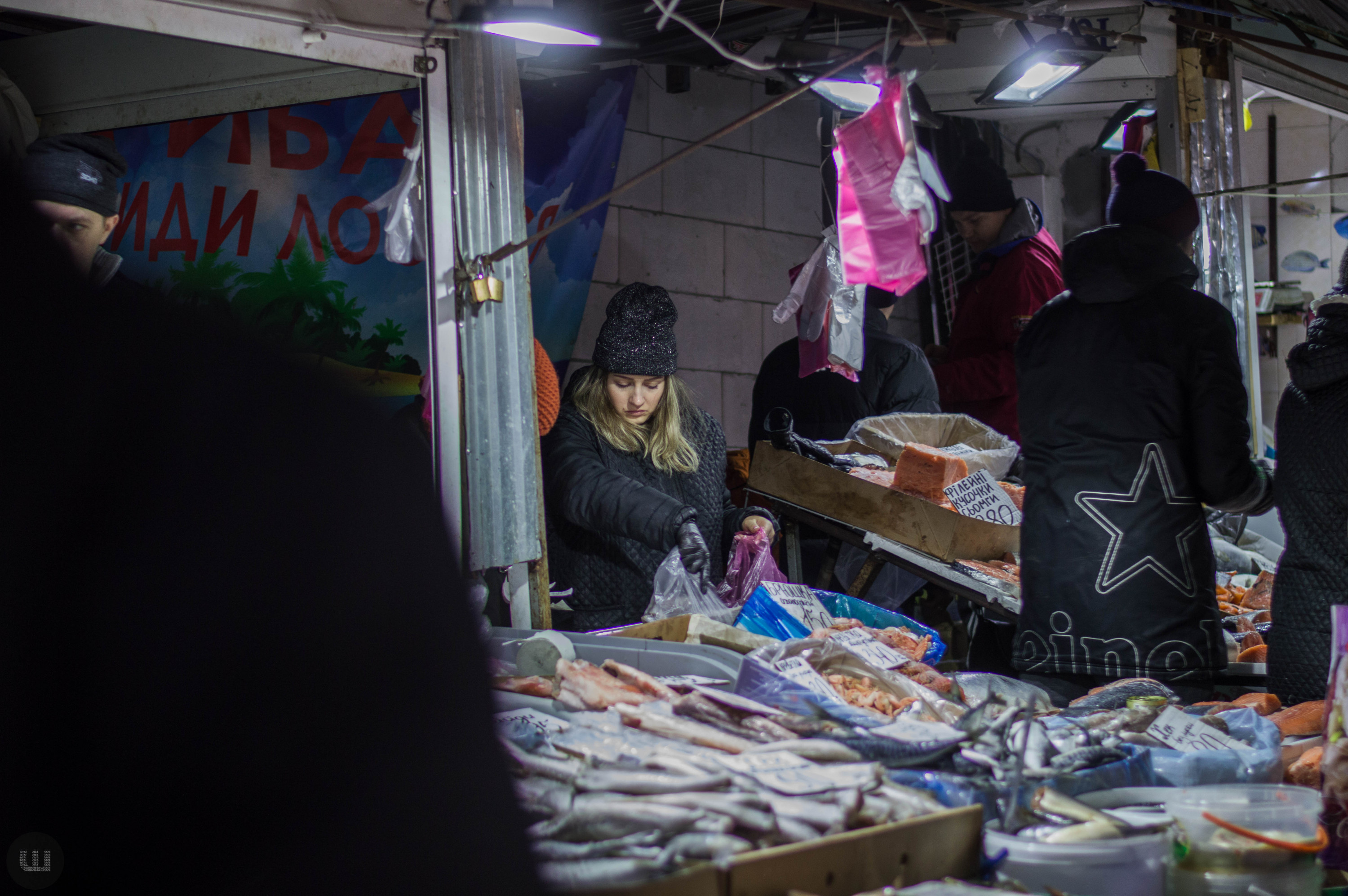 Спускаємося з Тетяною вниз. Починає сильно пахнути живою рибою. Ми не помиляємося – поруч відділ морепродуктів. Підходимо до продавця В’ячеслава. Чоловік каже, що зараз дуже багато покупців.