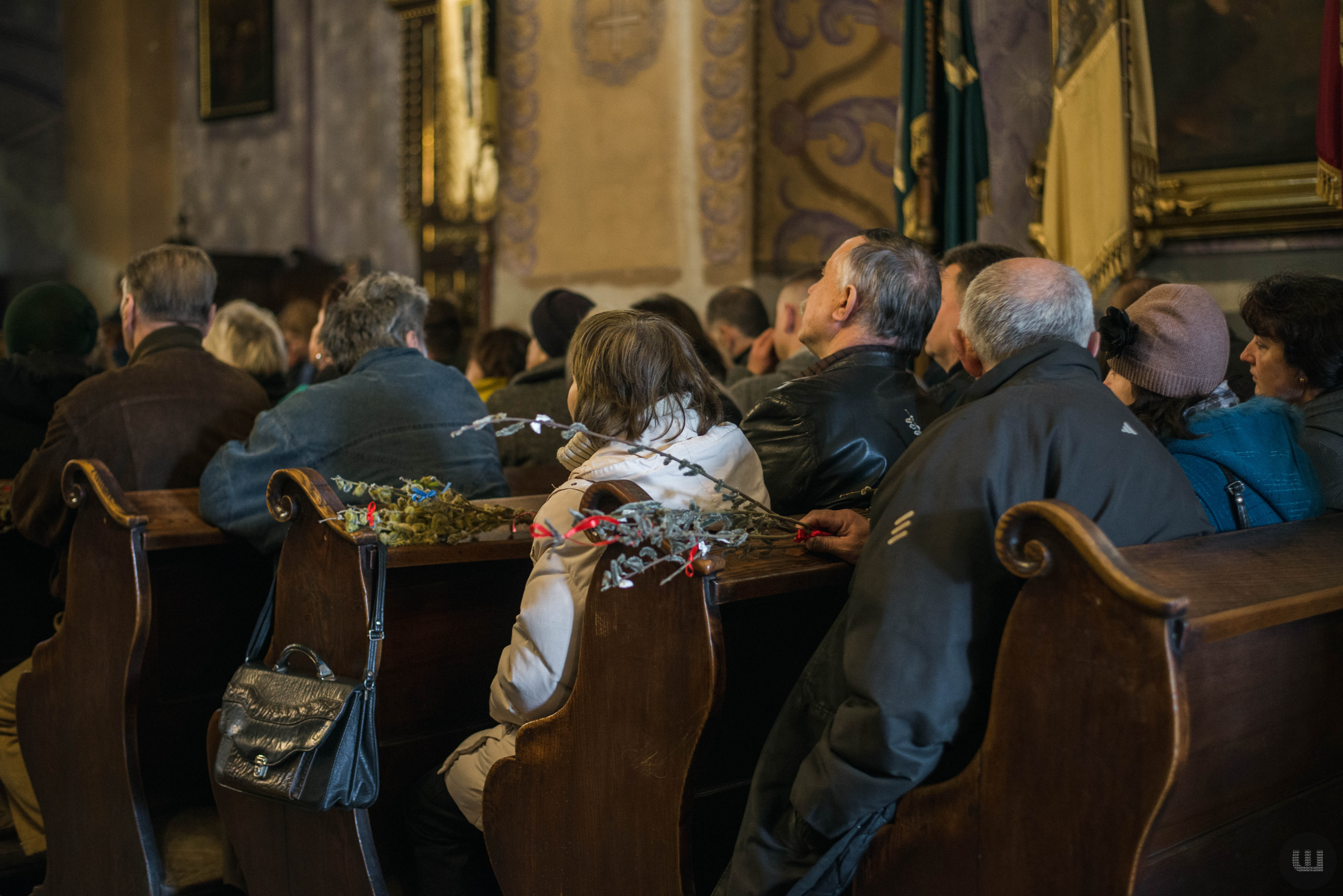 На святкову Месу парафіяни костелу Водзвиження Всечесного Хреста у Чернівцях прийшли не лише з традиційними в Україні вербовими галузками, а й пальмовими гілками. Цього дня людям не шкода відламати гілочку від вазона.