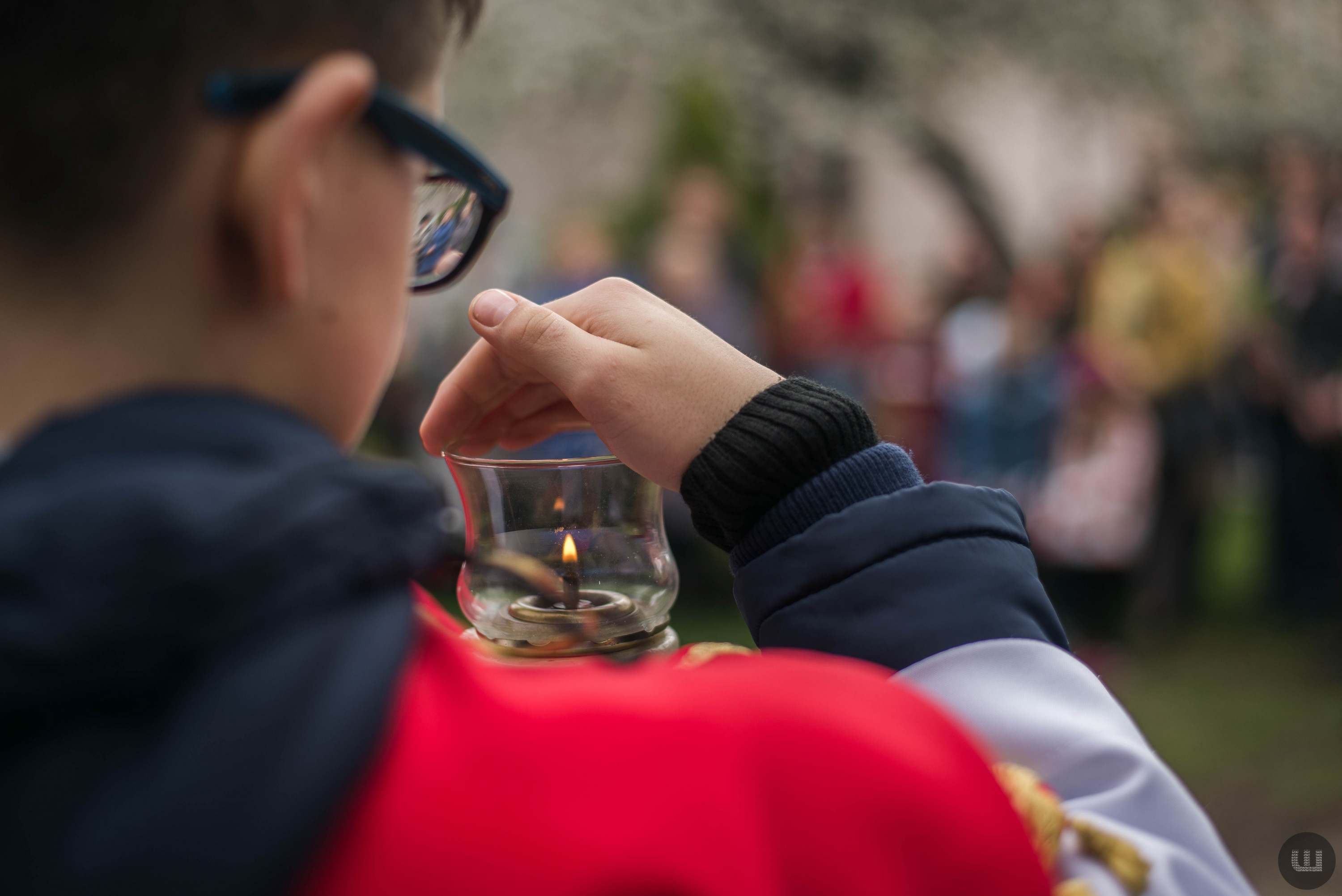 Цілий день костел відчинений. Ввечері у суботу на подвір’ї храму запалюють великий вогонь, від якого священик запалює головну свічку – пасхал, і заносить її у темний храм. Відтак світло вмикають, люди запалюють свічки, як символ нашої віри. На цій Літургії читають короткі уривки від початку створення світу і до воскресіння Ісуса. В цей момент починають дзвонити дзвони і грати орган. Бо в четвер і п’ятницю орган у костелі замовкає…», – сказала вона.