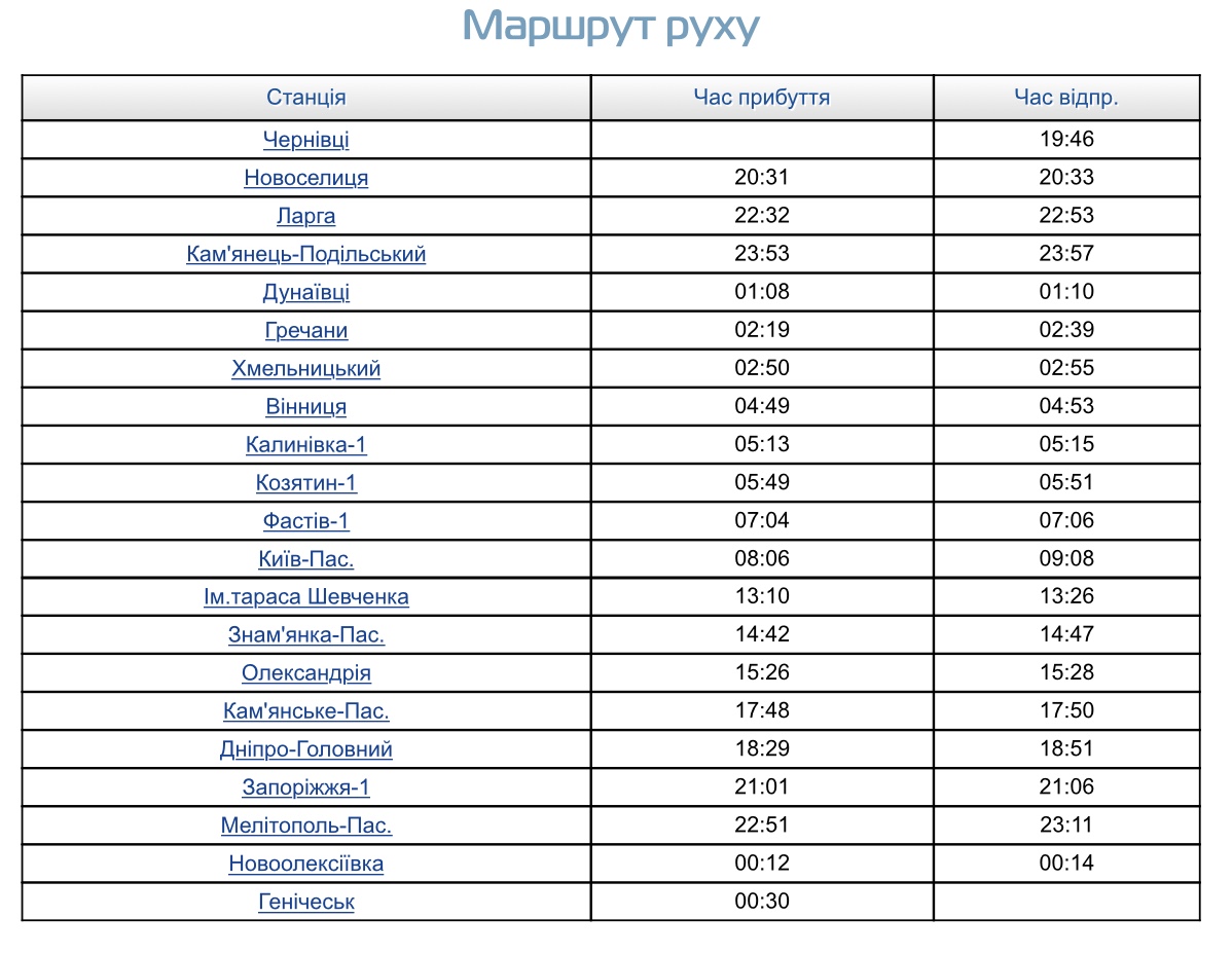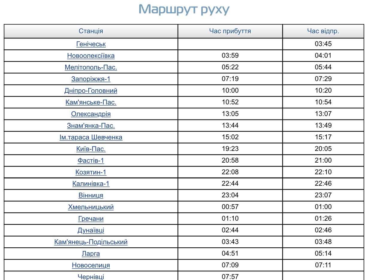 Натомість із Чернівців поїзд вирушатиме о 19:46, а прибуватиме до Генічеська більше, ніж за добу, — о 00:30. Маршрут буде проходити через Запоріжжя, Дніпро, Київ, Вінницю, Хмельницький та Кам’янець-Подільський.