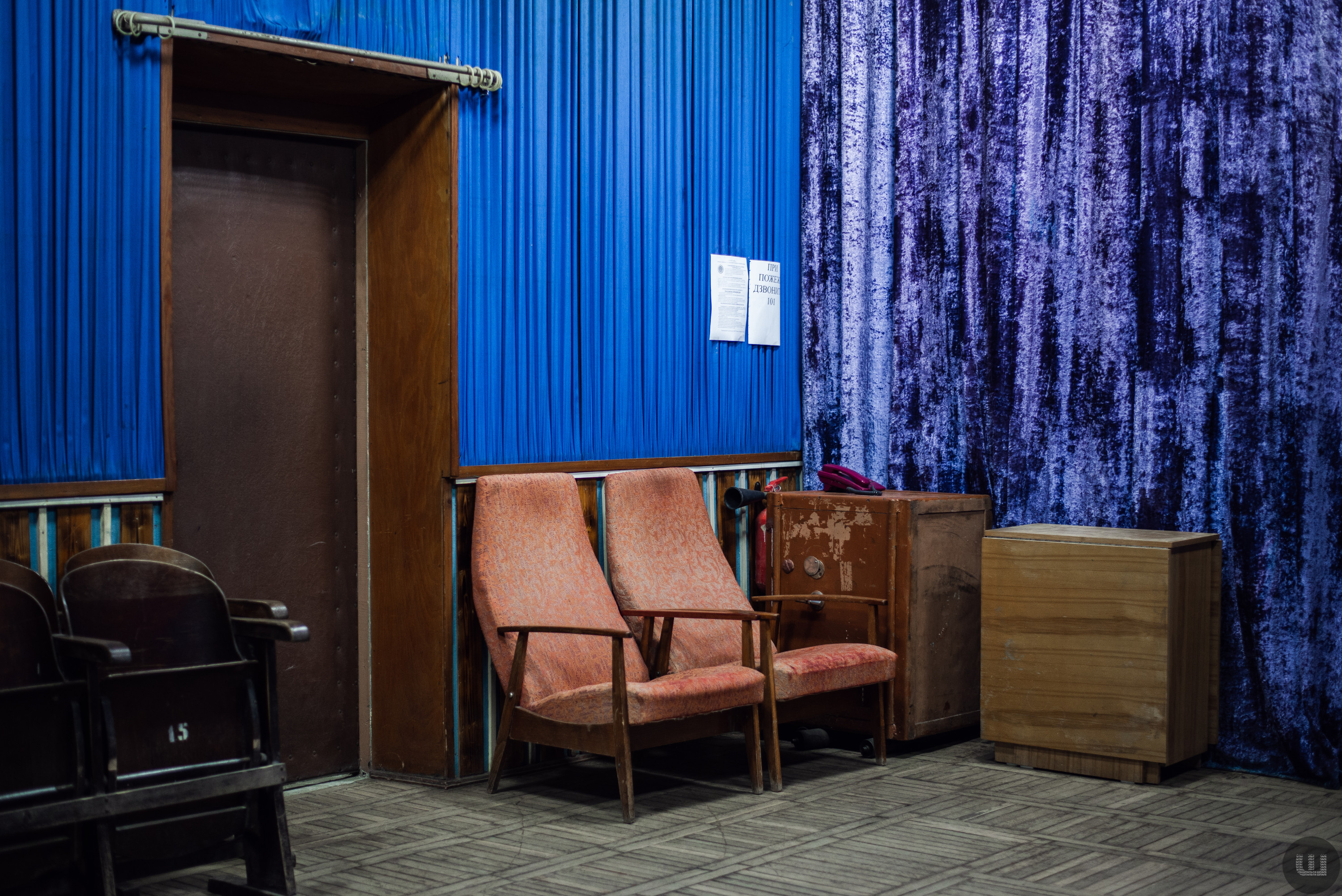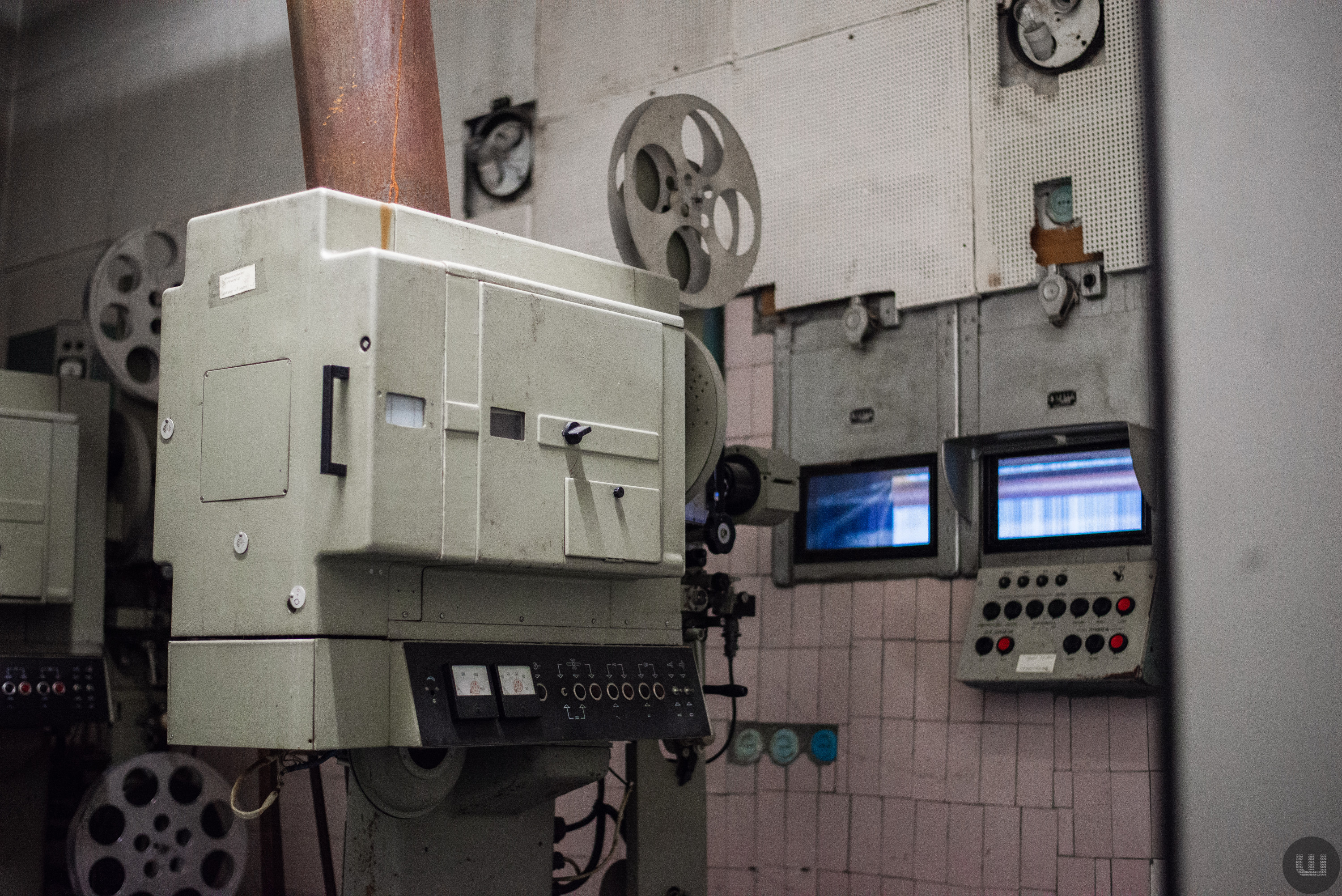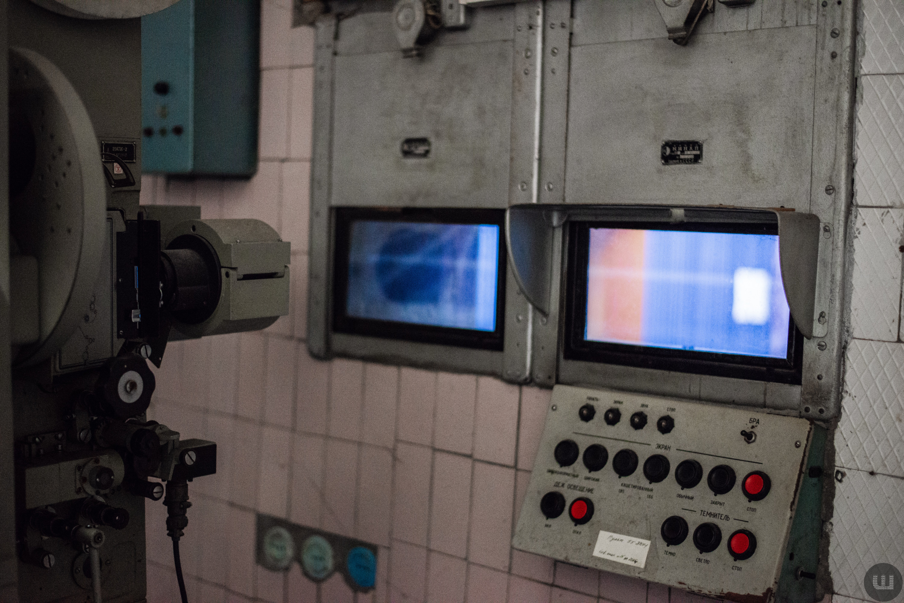 Заходимо в апаратну. Тут готували фільм для показу і перевіряли плівку. Звідси демонстрували фільми. Апаратна ще радянська, техніка приблизно 1980-х років, але все працює. Хочемо зробити тут музей.