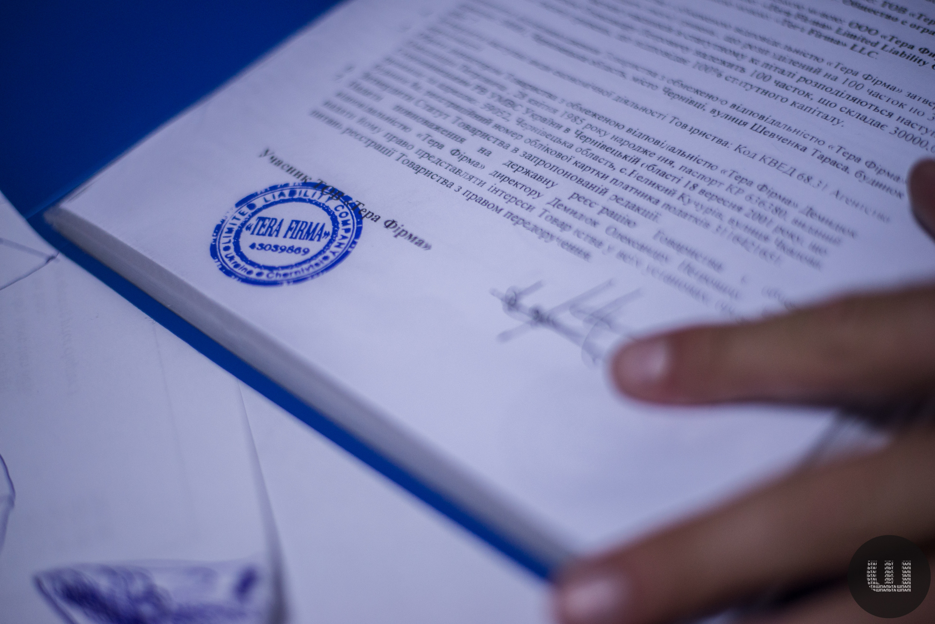 Він дістає із шухляди документи та вказує мені на суму. Як з’ясувалося, статутний капітал компанії «Тера Фірма» становить декілька десятків тисяч гривень.