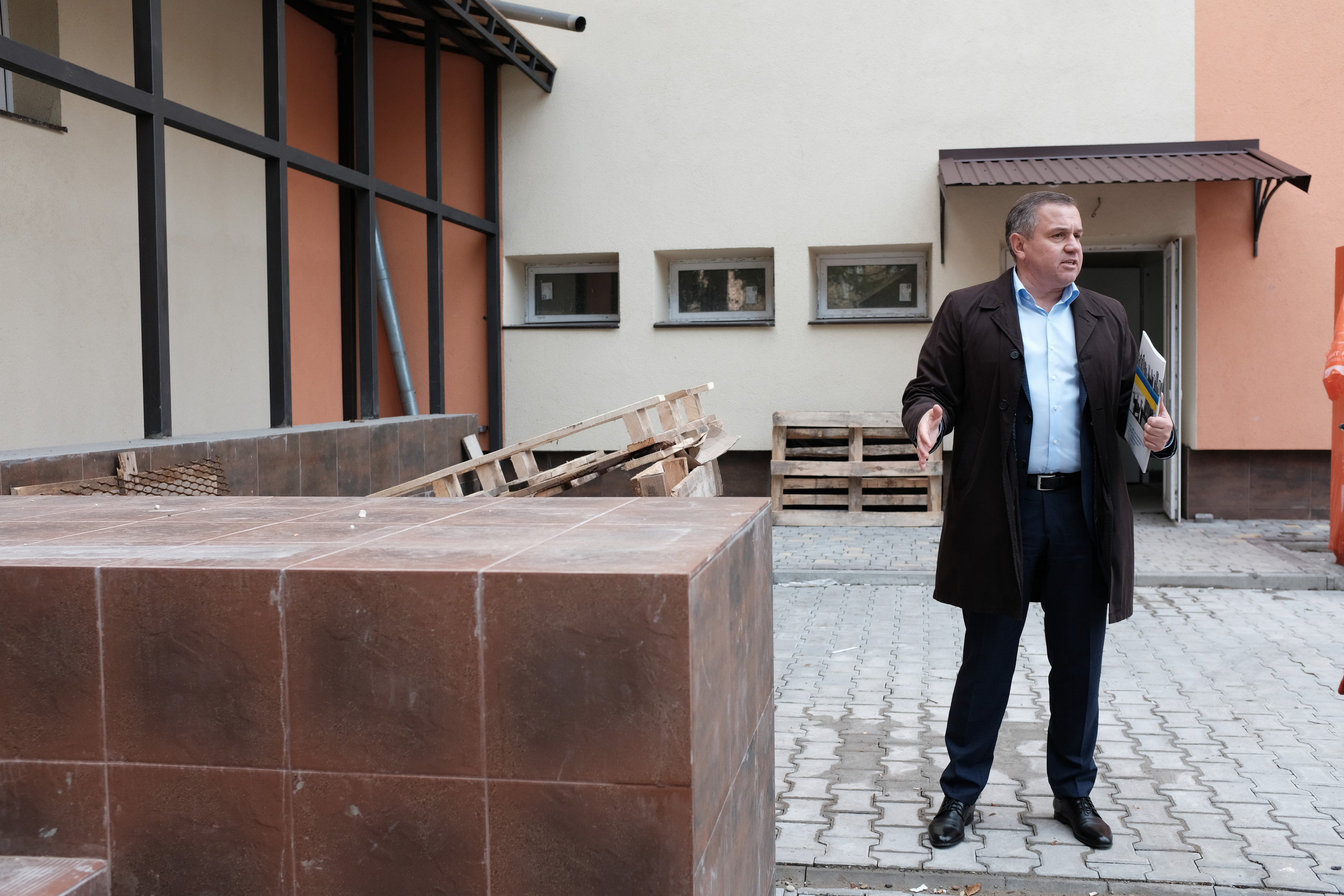 Підходимо ближче до головного входу лікарні. Олександр Пуршага розповідає, що головна причина, чому зовнішні роботи ще не завершені, – фінансування. Також цікавлюся, чому реконструкція перинатального так затягнулася.