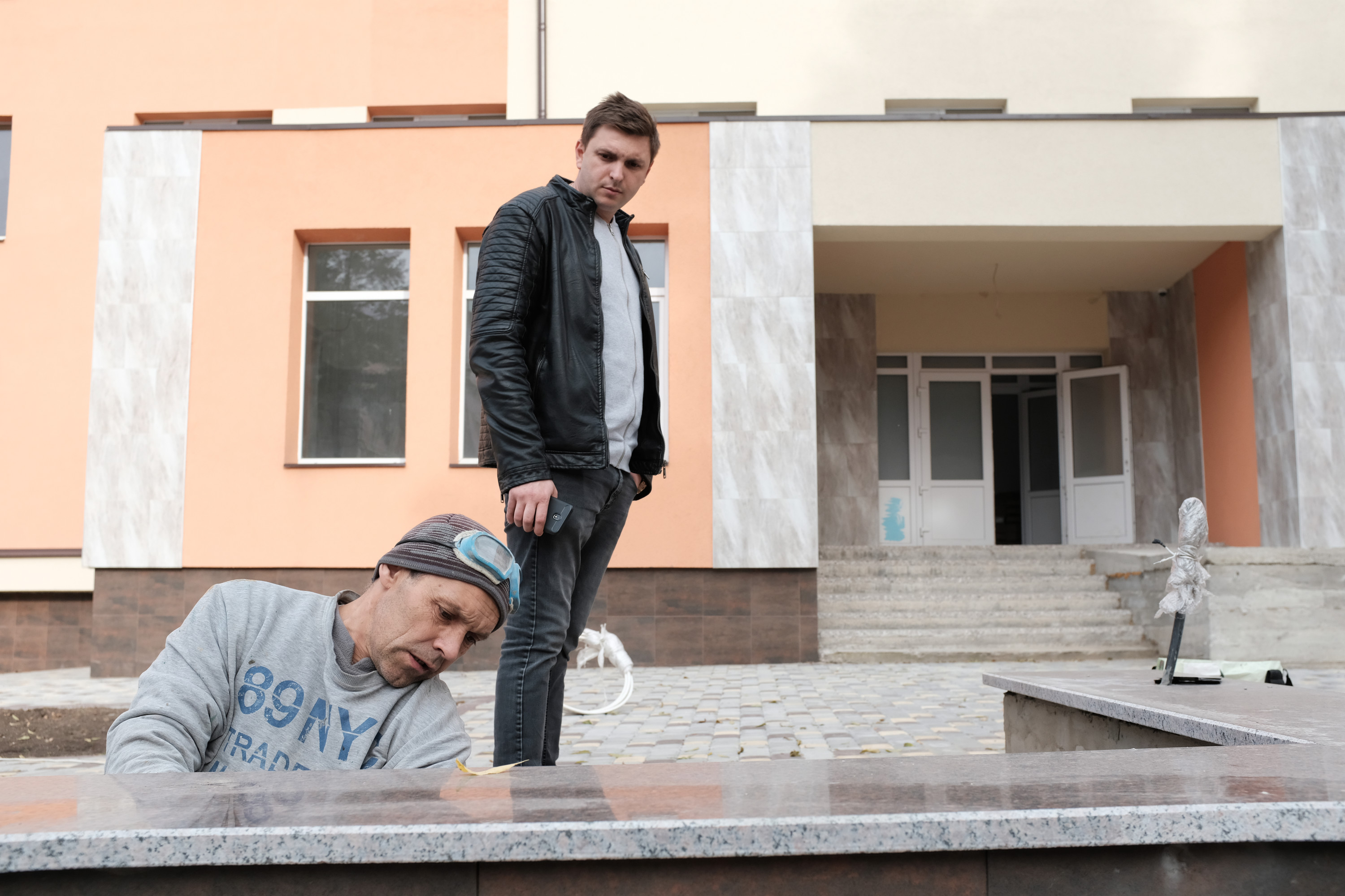 Біля великої новенької будівлі центру саме працюють робочі. Вони завершують монтаж плитки на території парковки для працівників медзакладу.