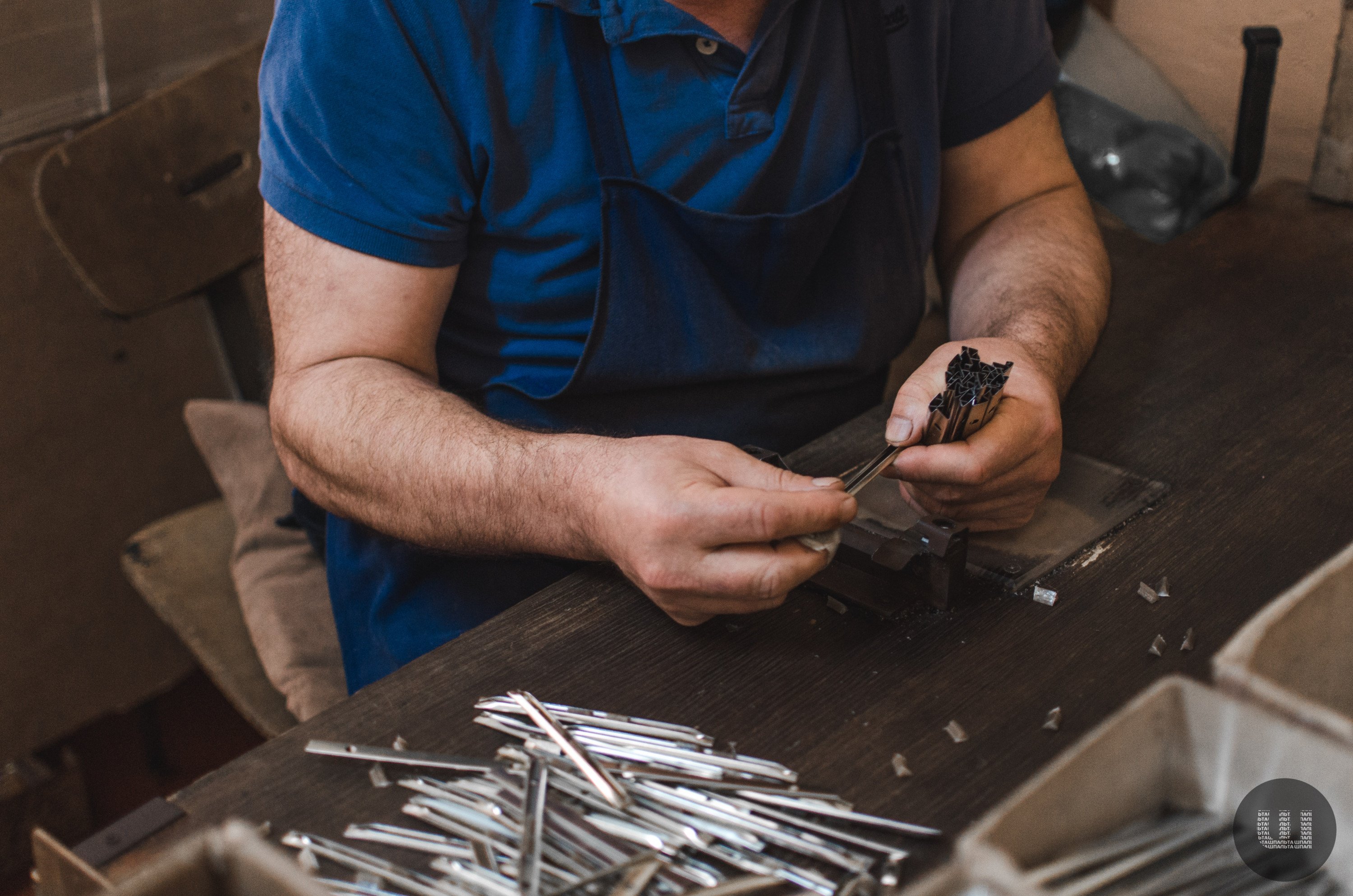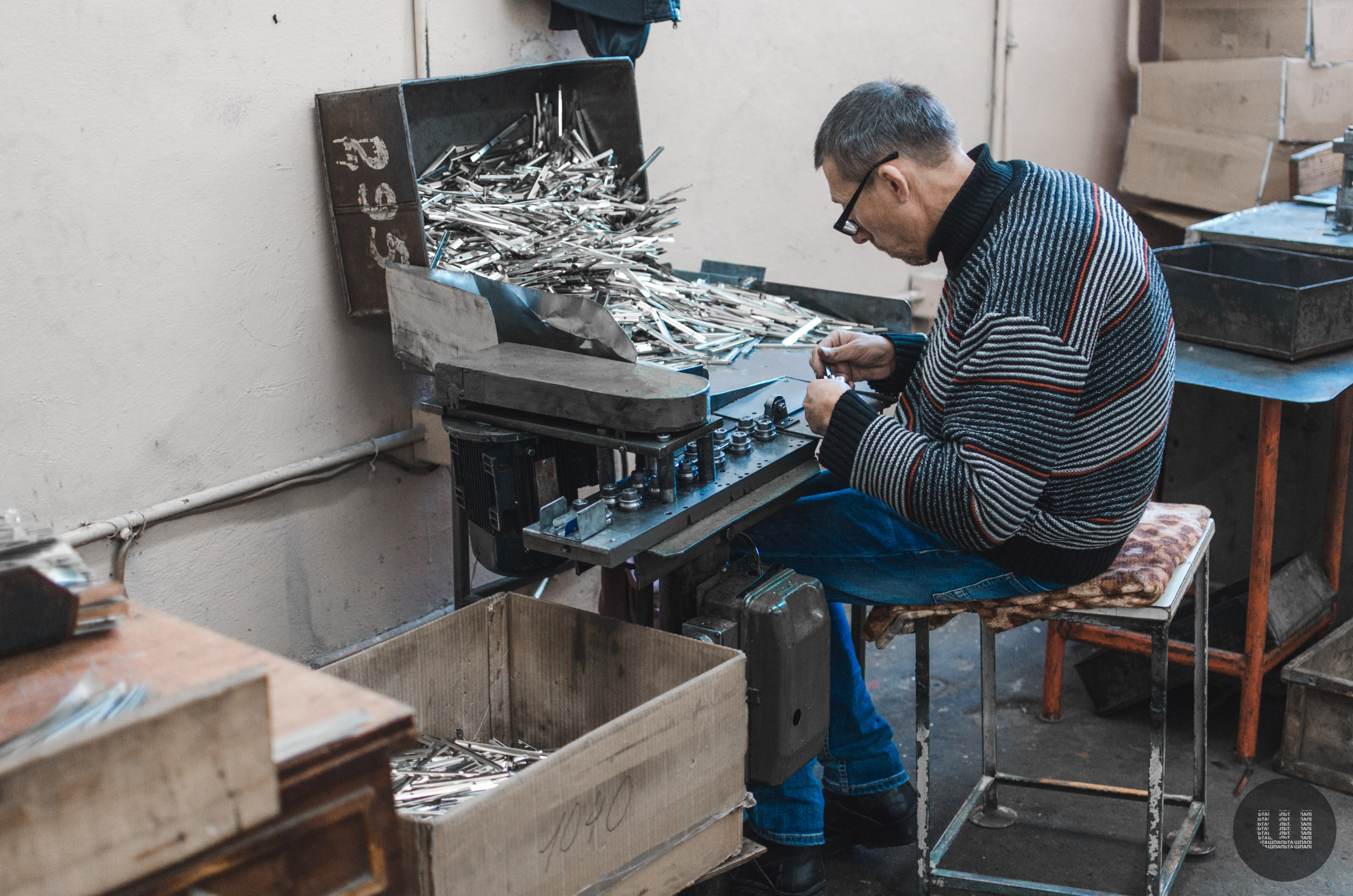 У сусідній кімнаті працюють над виготовленням замочків і голочок для швидкозшивачів. Робота копітка і потребує швидкості рук. Іван Танчук уже 40 років працює на виробництві УТОСу. Виготовляє замочки та акуратно пакує їх у коробочки.