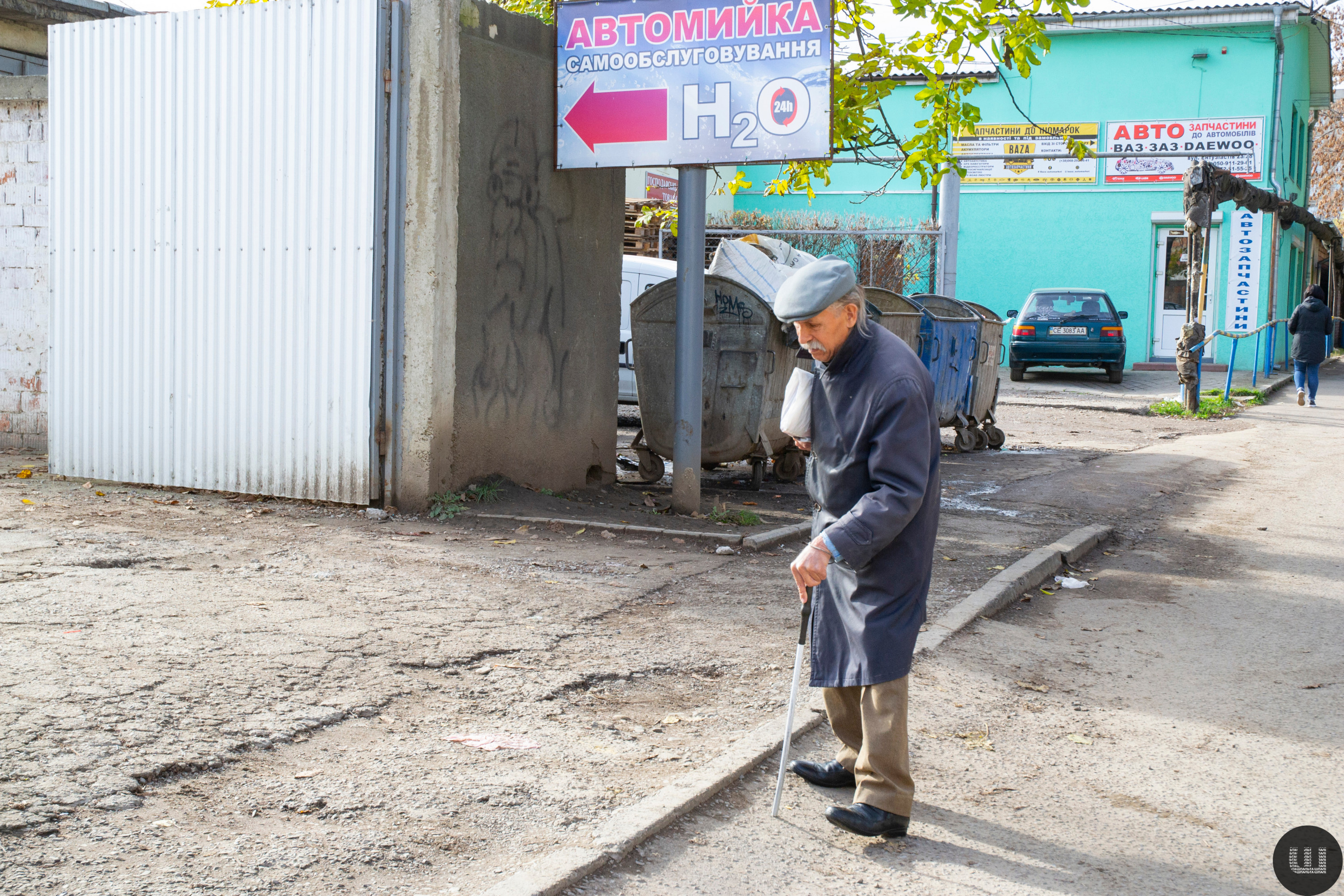 Поки ми говоримо, обережно шукаючи бардюр, іде старенький. Тотально незрячий і нечуючий чернівчанин.