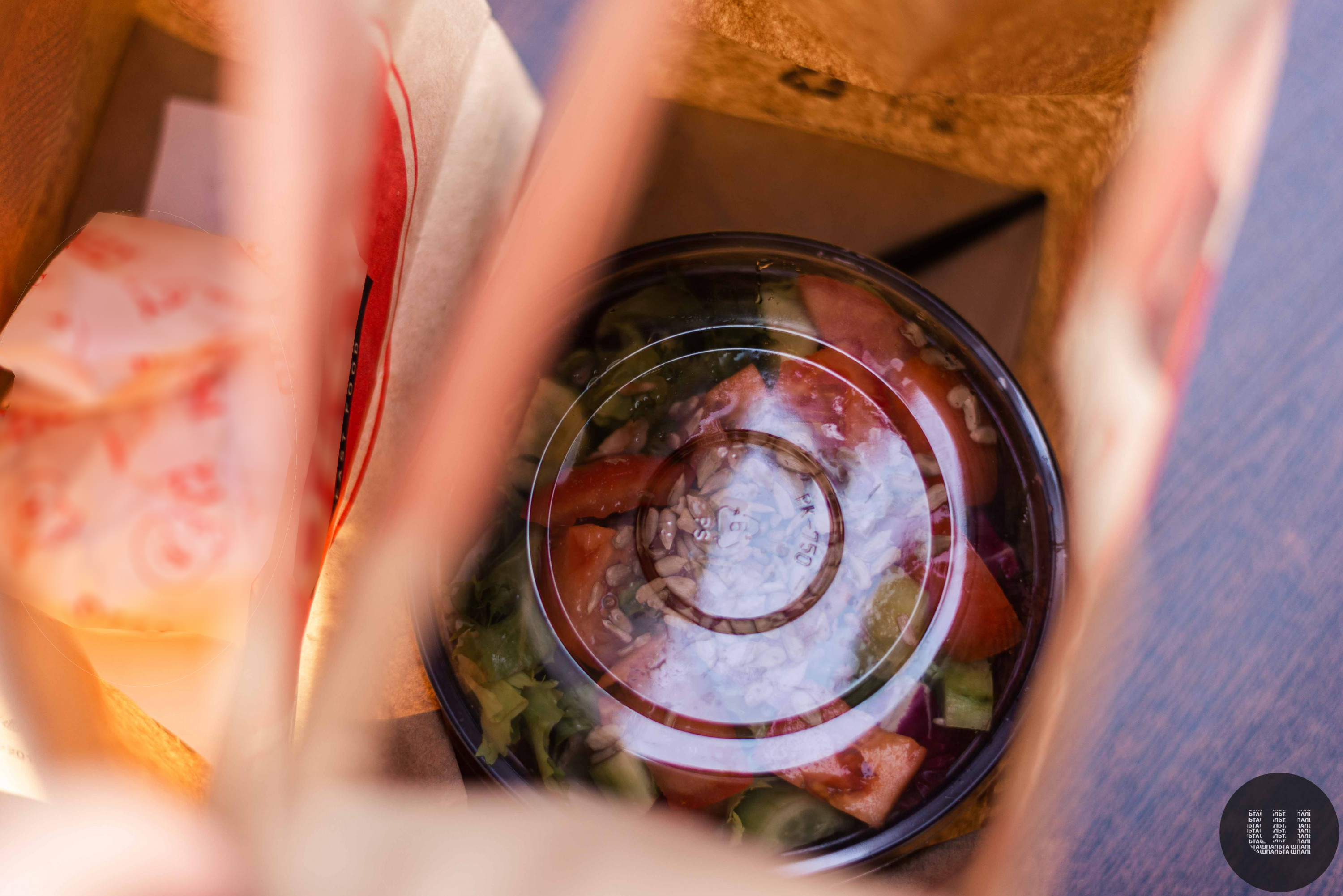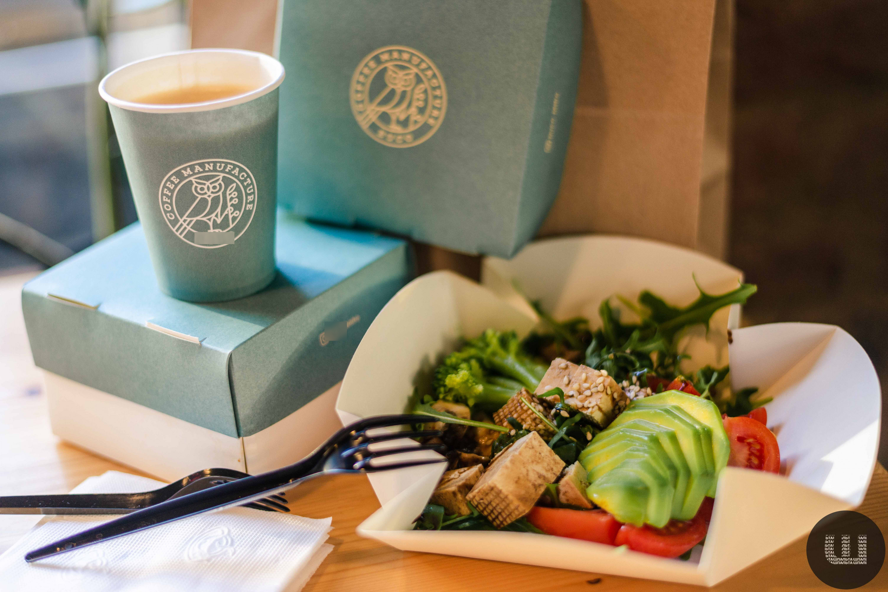 Замовляю сендвіч, салат та какао. Прошу оформити все з собою. Через декілька хвилин мені видають замовлення: два паперові пакети та напій у паперовому стакані. Розгортаю пакети, сендвіч загорнутий додатково у папір, а салат — у пластиковій посудині з кришкою. Також є пластикова виделка. Поліетиленових пакетів тут не дають, і це тішить.