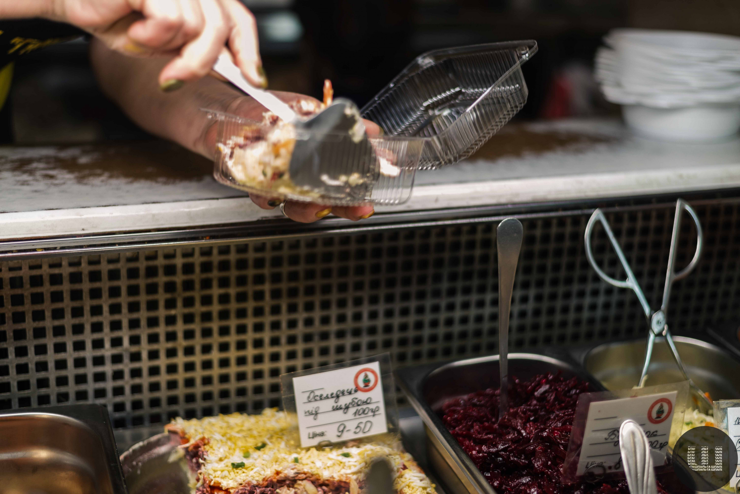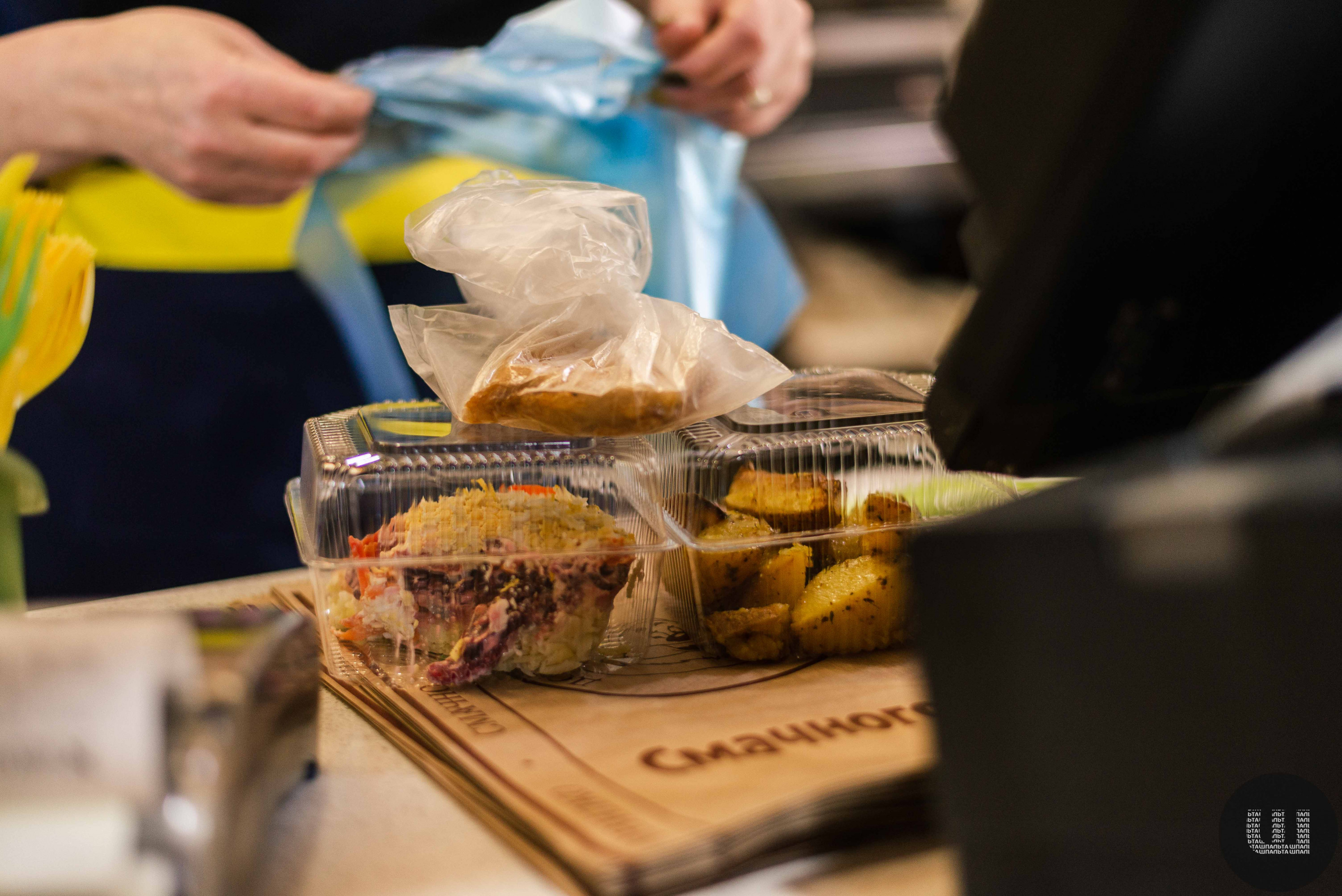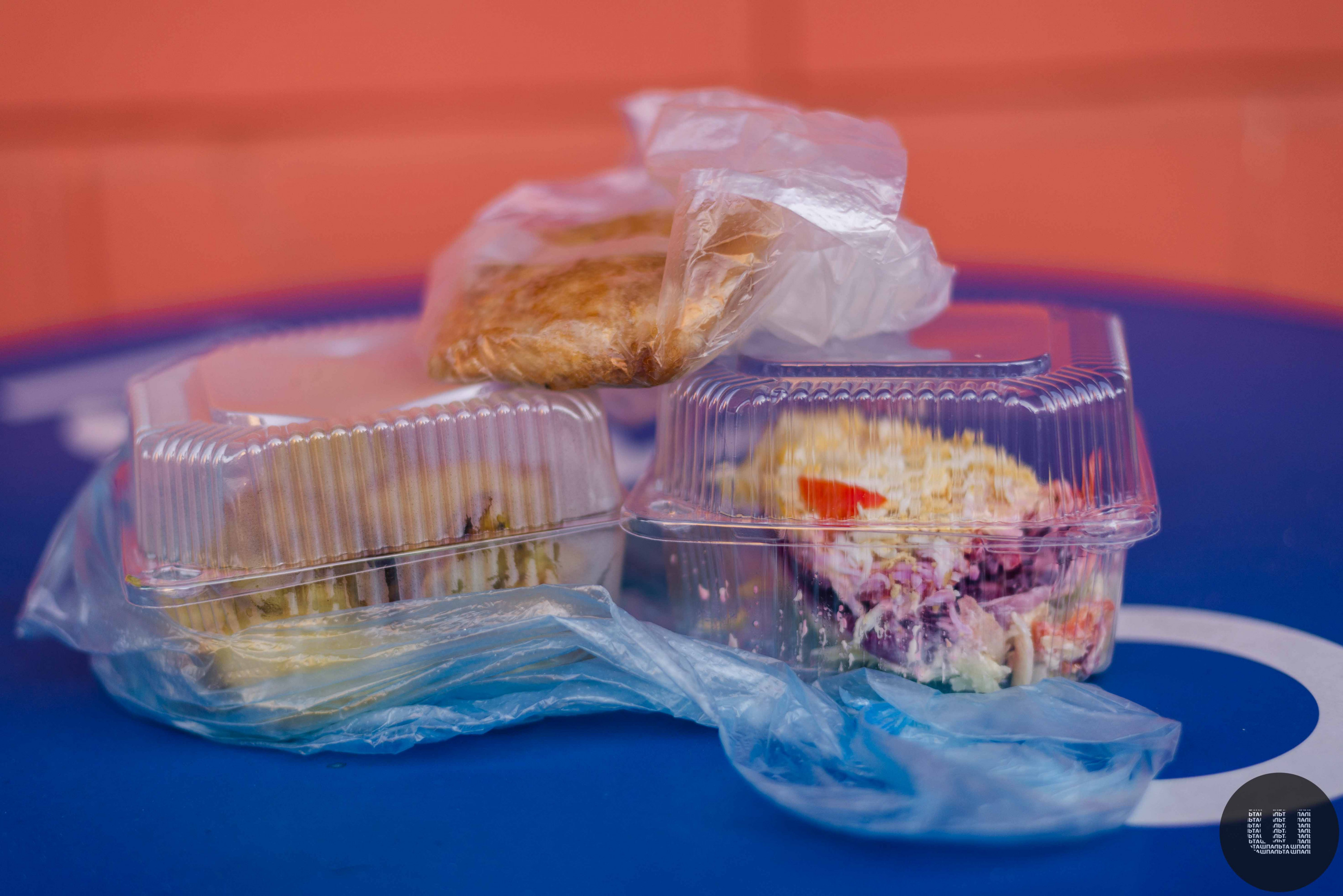 У цьому закладі я вирішила взяти також салат, а ще печену картоплю та млинець із м’ясом. Усе прошу оформити з собою. Продавчиня складає мені обід у два пластикові контейнери та поліетиленовий пакет. Ще один пакет дає, аби все скласти у нього.