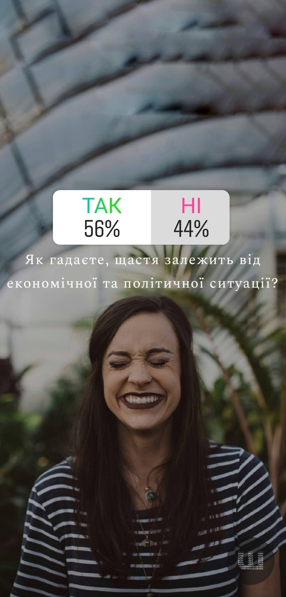 56% опитаних гадають, що рівень щастя залежить від економічної та політичної ситуації, інші 44% — що ці поняття не зіставні.