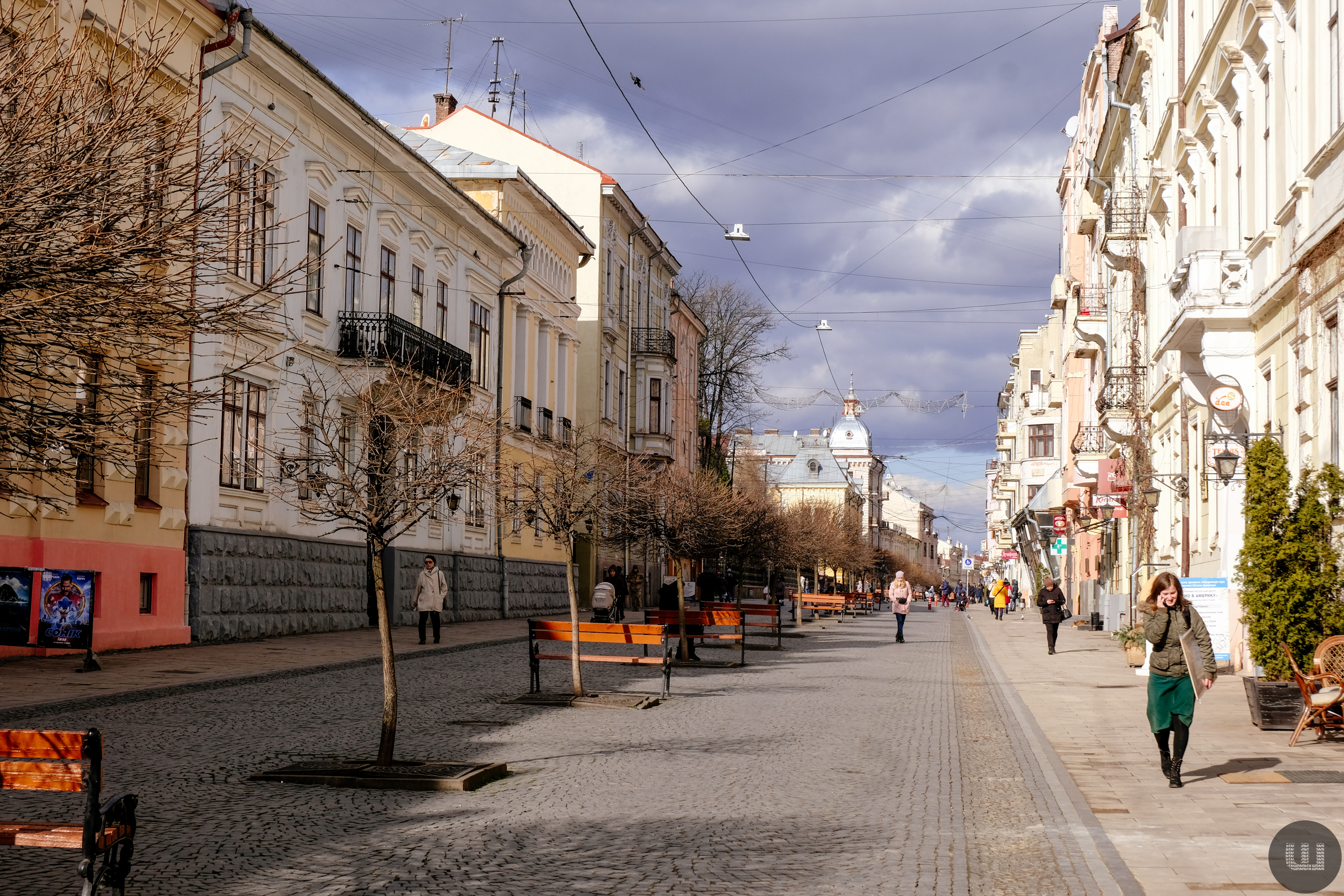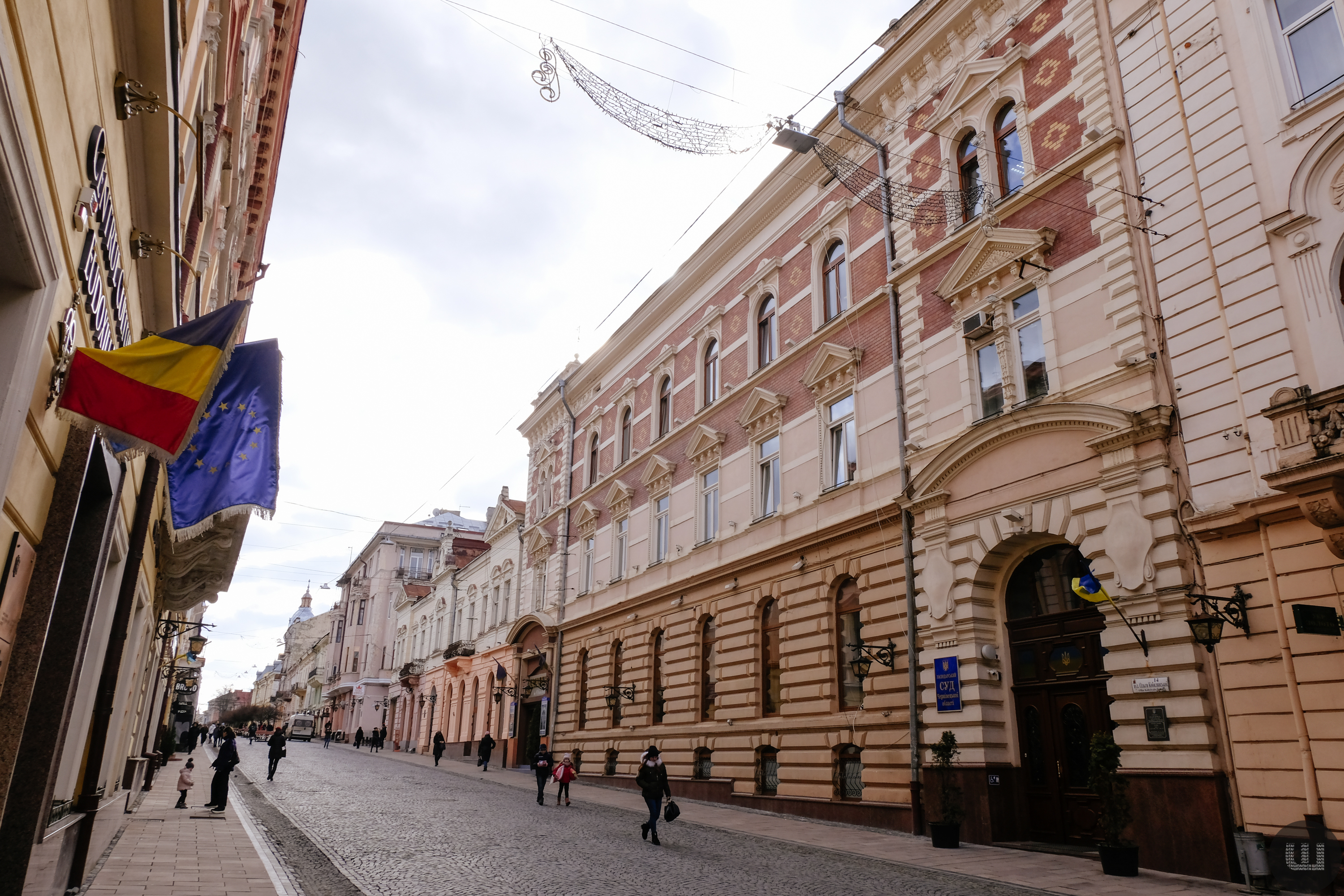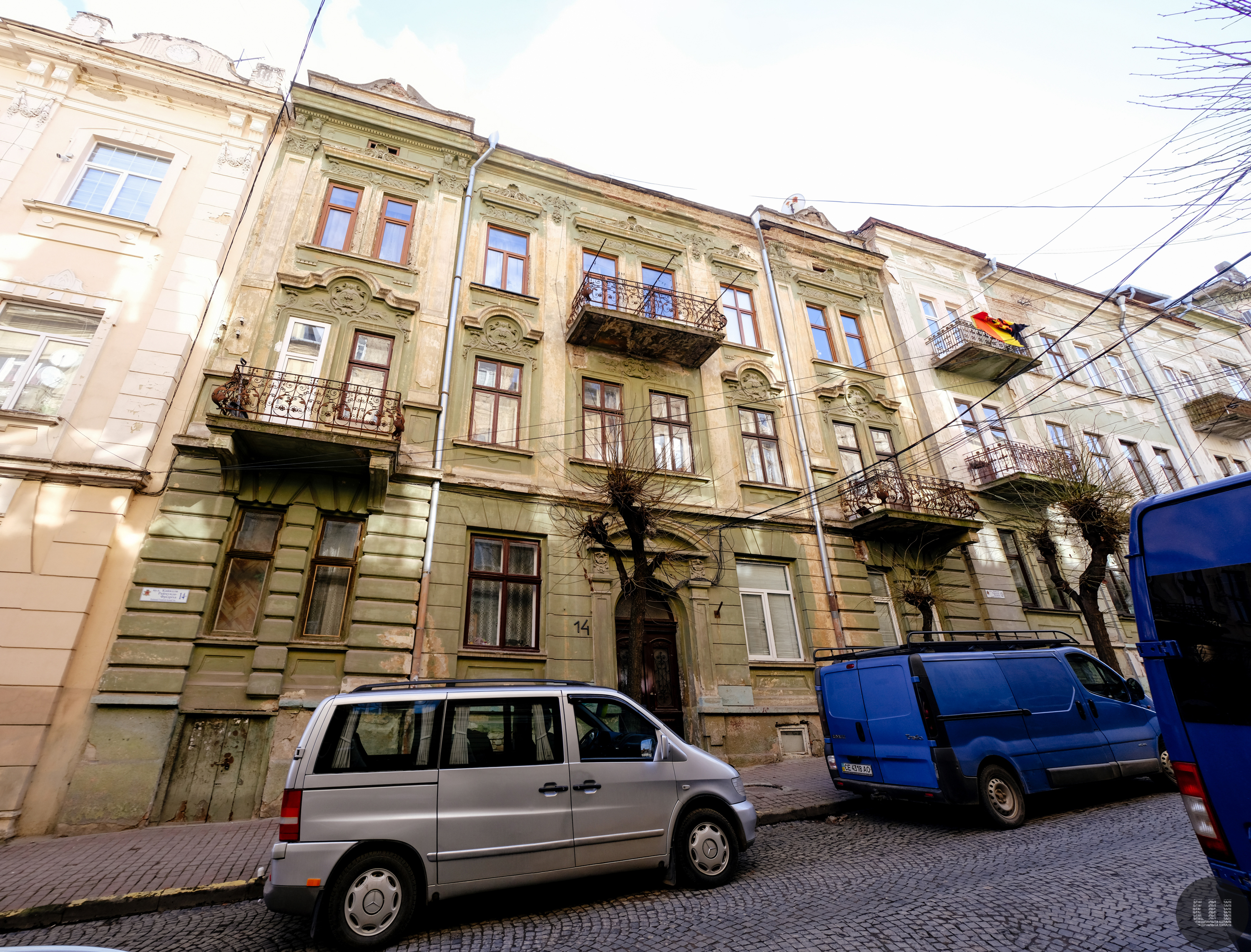 Із вулиці Ольги Кобилянської спускаємося вниз вулицею Р. Кайндля. Праворуч – будівля кінця ХІХ століття. Саме тут на другому поверсі мешкала родина Адальберта Гржімалі у Чернівцях.