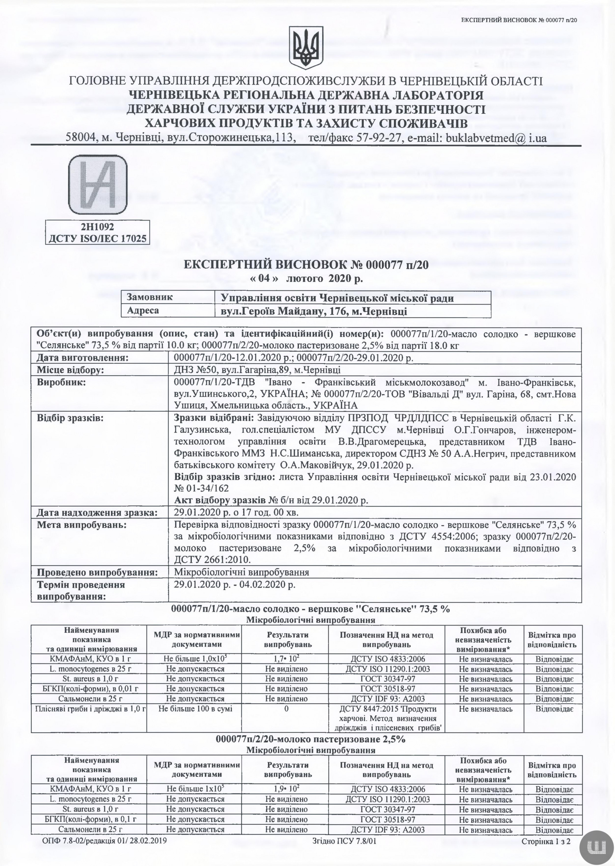 Лише 29 січня 2020 року до Чернівців прибули представники ТДВ «Івано-Франківський міськмолокозавод». Уже тоді разом із управлінням освіти та Держпродспоживслужбою провели забір у трьох випадкових навчальних закладах: ДНЗ №15, ДНЗ №36 та ДНЗ №50. В експертизі вершкового масла «Селянське» за 4 лютого зазначено, що вся продукція відповідає нормам державних стандартів.