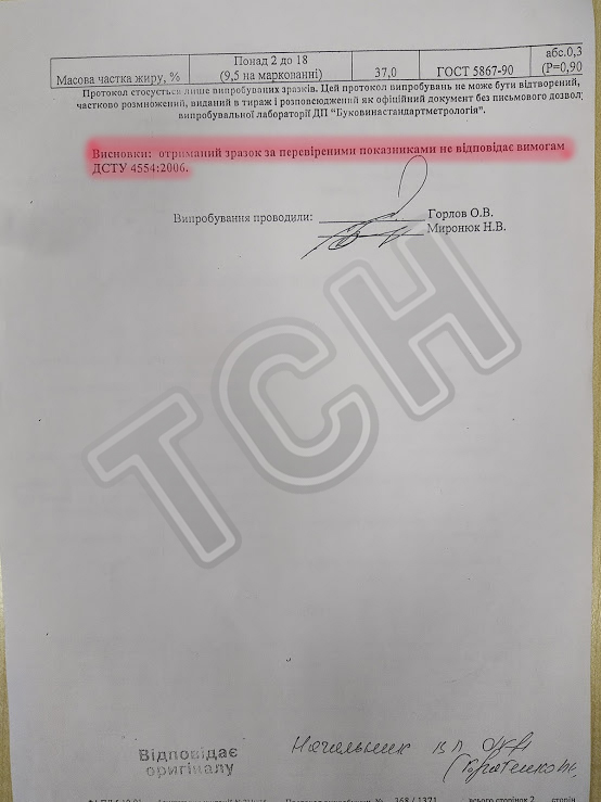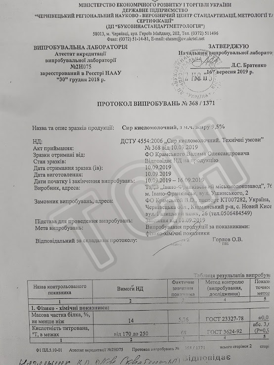 10 вересня ДП «Буковинастандартметрологія» отримала від жителя с. Нового Киселева Чернівецької області зразки кисломолочного сиру виробника ТДВ «Івано-Франківський міськмолокозавод». За даними дослідження, продукція не відповідала нормам ДСТУ. Цю інформацію ми знайшли у документах, які оприлюднив журналіст Олег Тудан на своїй сторінці у фейсбуку.