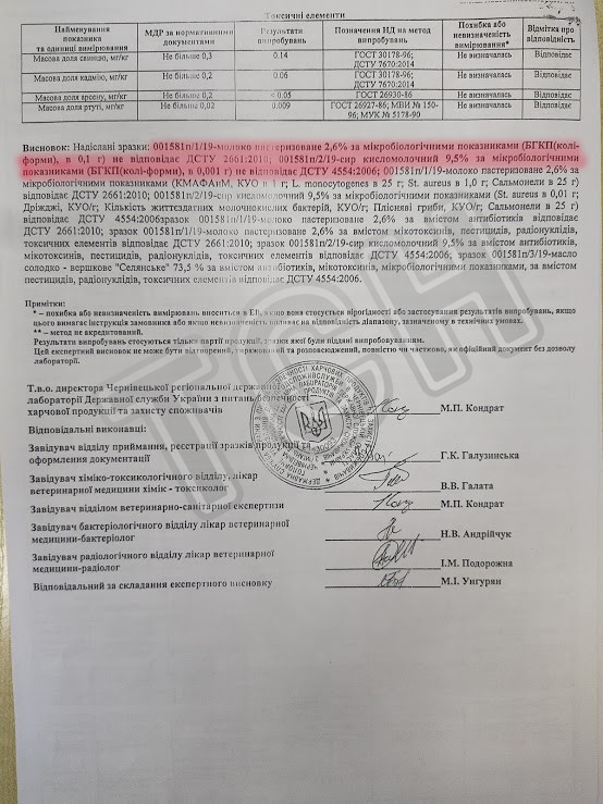 У документі йдесять, що, за результатами лабораторних випробувань, встановлено факти невідповідности продукції вимогам ДСТУ та іншим умовам якости товару, зазначеним у договорі. Зокрема молоко пастеризоване 2,6% та сир кисломолочний 9,5% за мікробіологічними показниками (БГКП (колі-форми)), показником «кислотність титрована», «наявність немолочних жирів» не відповідає ДСТУ 2661:2010 та ДСТУ 4554:2006.