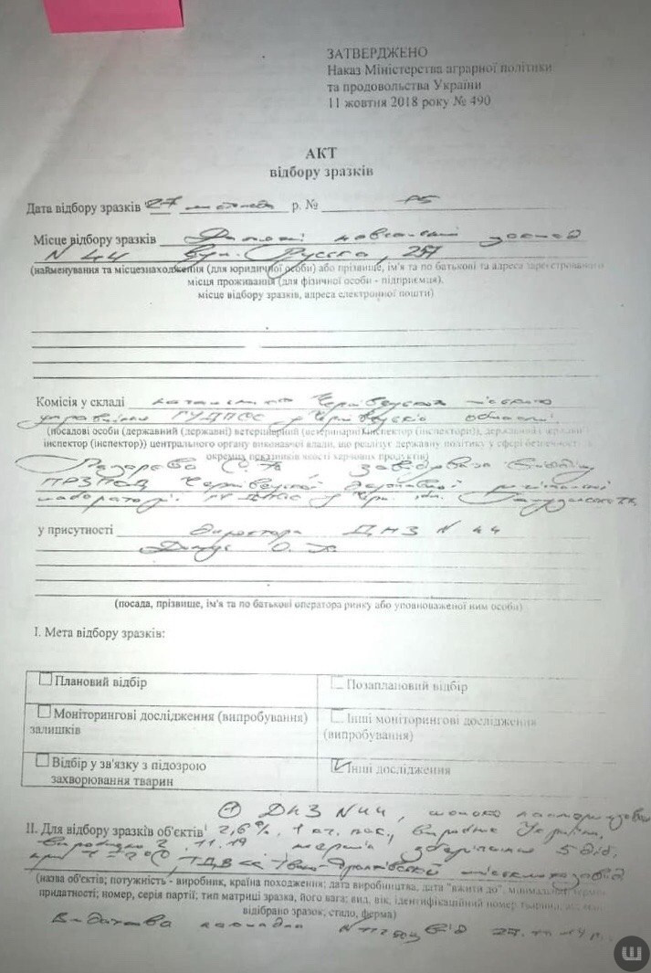 Держпродспоживслужба надала нам акти відбору продукції за 27 листопада 2019 року. Там вказано, що пристуніми під час забору були представники Держпродспоживслужби та її лабораторії, а також директори дошкільних закладів: