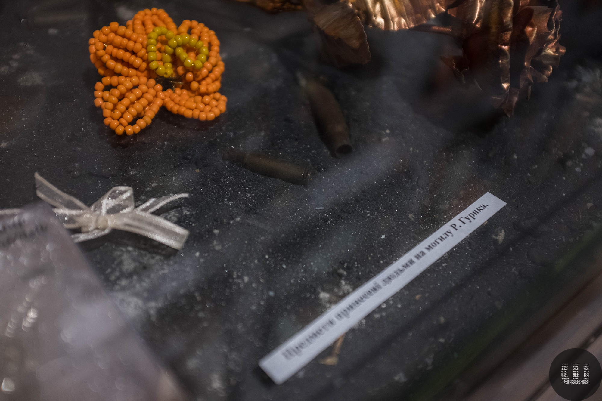 Ірина підводить нас до його стенду. Це декілька фотографій, іконка, яку він носив на грудях, кросівки, у яких ходив Майданом. В окремій вітрині розміщений рюкзак – той самий, з обгортками від цукерок. Якщо уважно придивитися, то на ньому все ще видно плями крові – він був на хлопцеві, коли в його голову влучила куля.