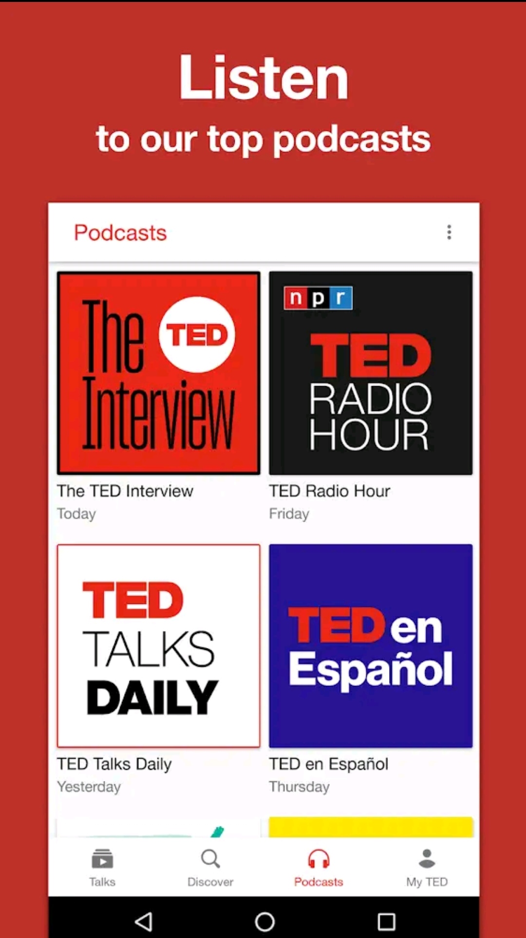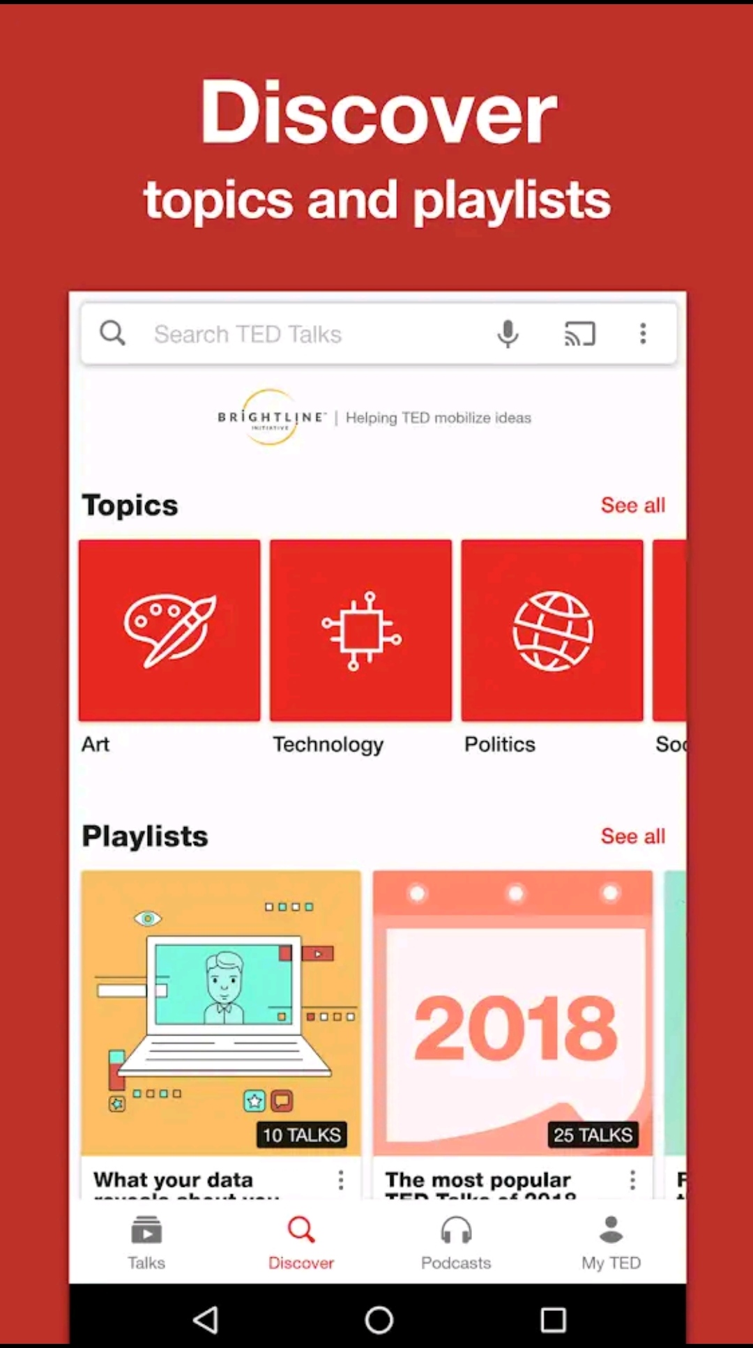 У додатку TED зручне меню пошуку. Ви можете обрати тему лекції, лектора, мову або прослухати готовий плейлист на тему, яка користується попитом у суспільстві.