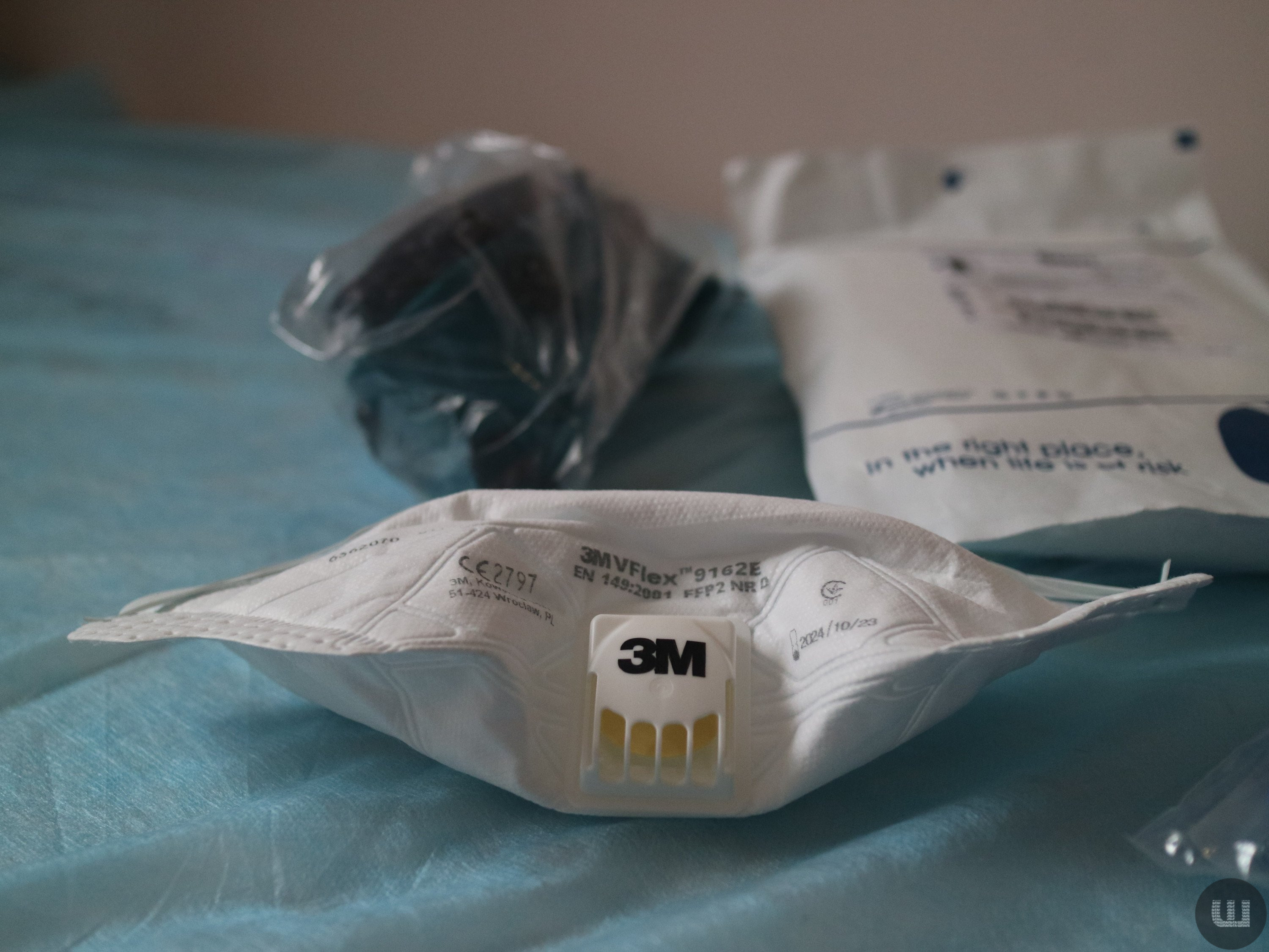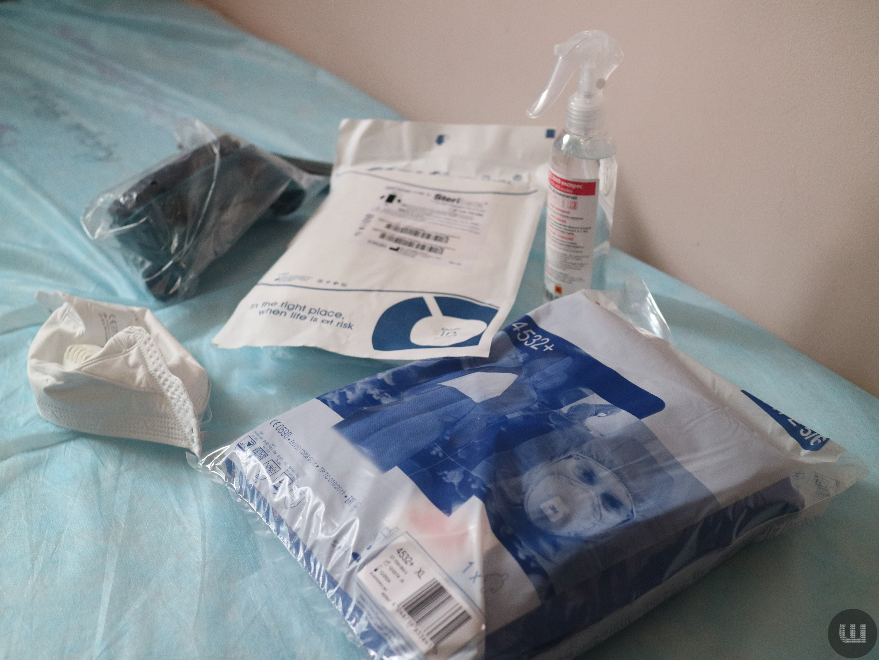 Вона демонструє нам захисні костюми. Це комбінезон синього кольору, респіратор, захисні окуляри та антисептик.