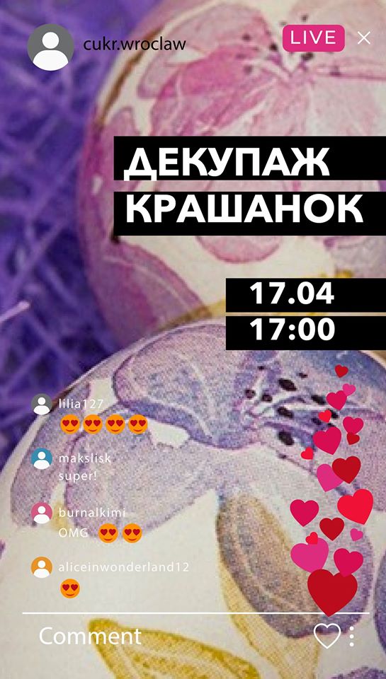 - П’ятниця, 17 квітня, о 17:00 — Пасхальний майстер-клас «Декупаж крашанок».