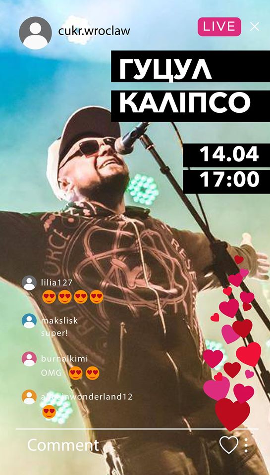 - Вівторок, 14 квітня, о 17:00 — онлайн-концерт українського гурту «Гуцул Каліпсо»