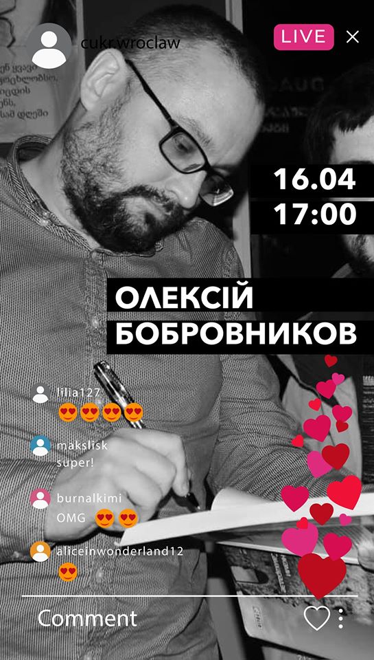 - Четвер, 16 квітня, о 17:00 — літературна зустріч з Олексієм Бобровниковим, а саме читання книги «Краями Грузії. У пошуку скарбу країни вовків»