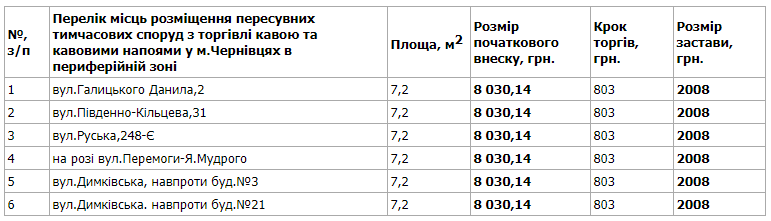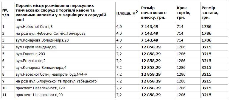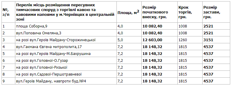 «Претендент під час торгів має право з голосу запропонувати розмір плати за користування елементами благоустрою з кроком не менше 10 відсотків від попередньо запропонованої ціни. Період розміщення пересувних тимчасових споруд у центральній, середній та периферійній зонах із 19.07.2020 по 18.07.2021 (365 календарних днів)», — пояснюють у міськраді.