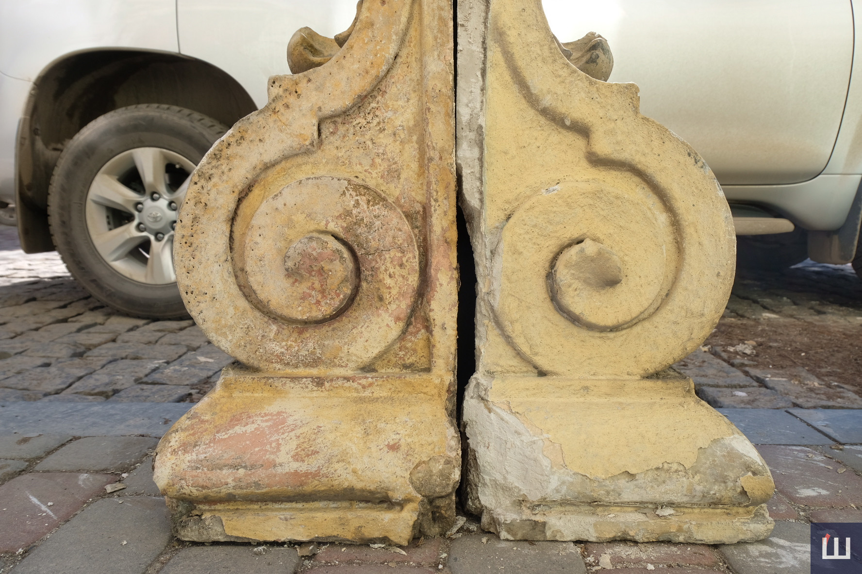 Декоративний кронштейн із будинку впав на автомобіль. Усі решта елементи фасаду також були в аварійному стані, тож їх вирішили демонтувати.