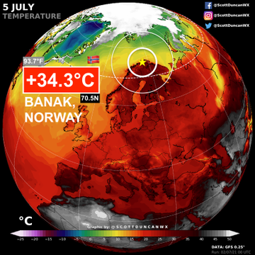 У виданні зазначають, що на національному рівні червень 2021 року став третім за величиною спекотним місяцем, зафіксованим у Швеції. Тим часом метеорологічний інститут Норвегії зареєстрував 34 градуси у Салтдал — окрузі, що недалеко від Полярного кола. Це найвища температура, виміряна в країні цього року, і лише на 1,6 градуса менша рекордного рівня Норвегії.