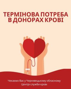 Донорів чекають сьогодні до 15:00 за адресою: місто Чернівці, вулиця Українська, 36. Кров необхідна для потреб Збройних сил України.