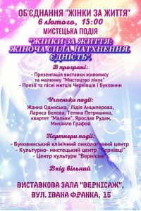 У програмі заходу – презентація виставки живопису та малюнку «Мистецтво лікує!», а також унікальних робіт, створених жінками під час студії живопису та малюнку «Танок кольорів і емоцій». Для гостей заходу поети і поетеси Чернівців та Буковини читатимуть авторську поезію.