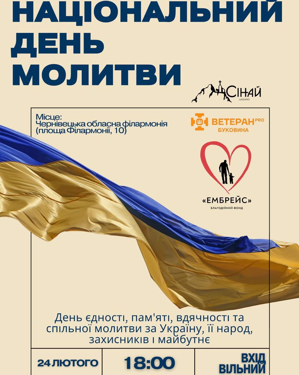 24 лютого о 18:00 у Чернівецькій обласній філармонії відбудеться захід до Дня Національної молитви та подяки Захисникам і Захисницям України та їхнім родинам.