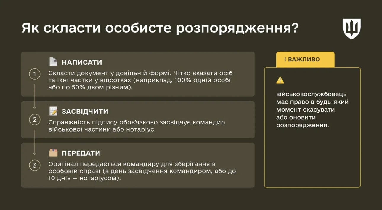 Важливо: військовослужбовець має право в будь-який момент скасувати або оновити розпорядження, склавши новий документ.