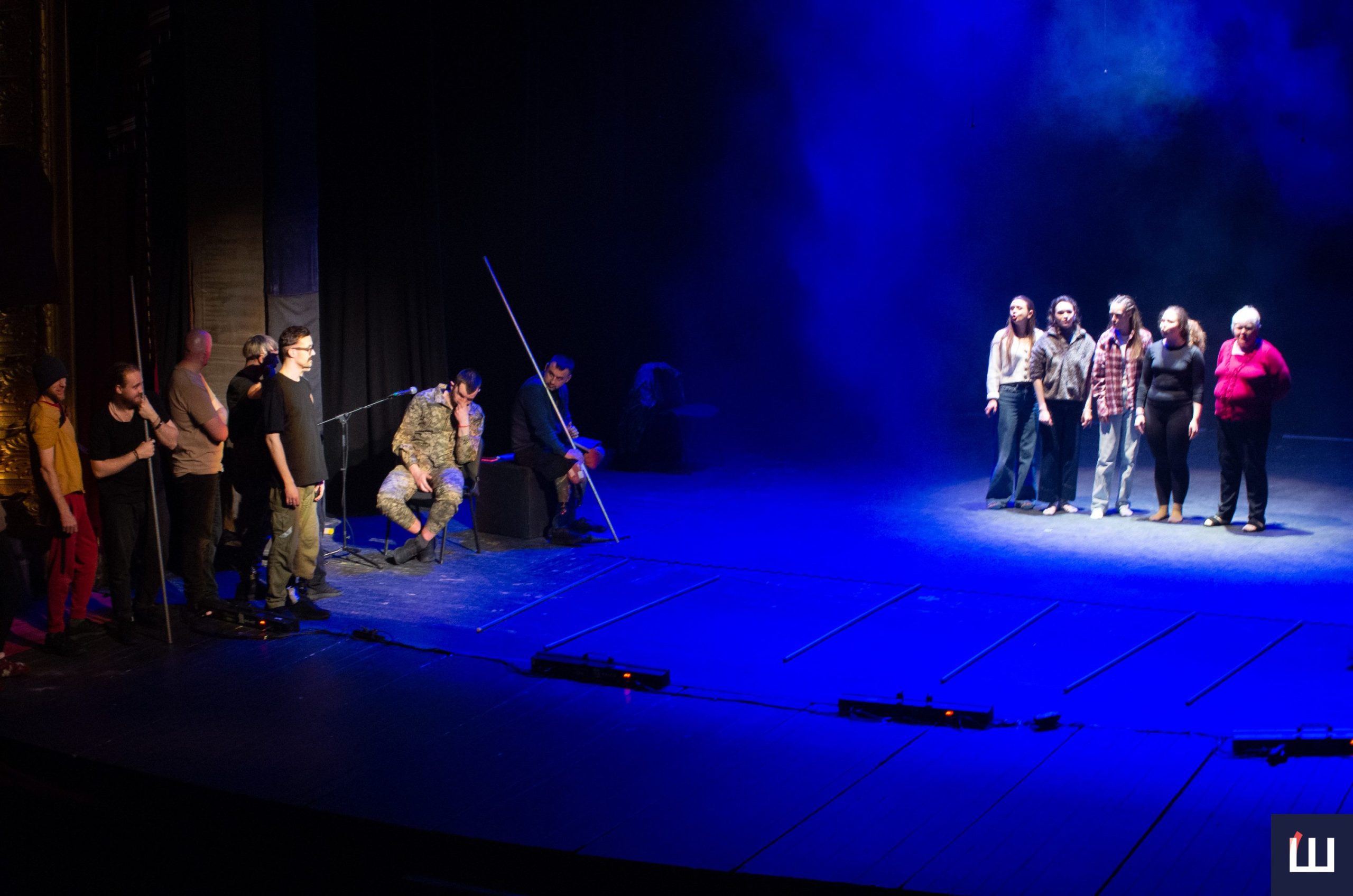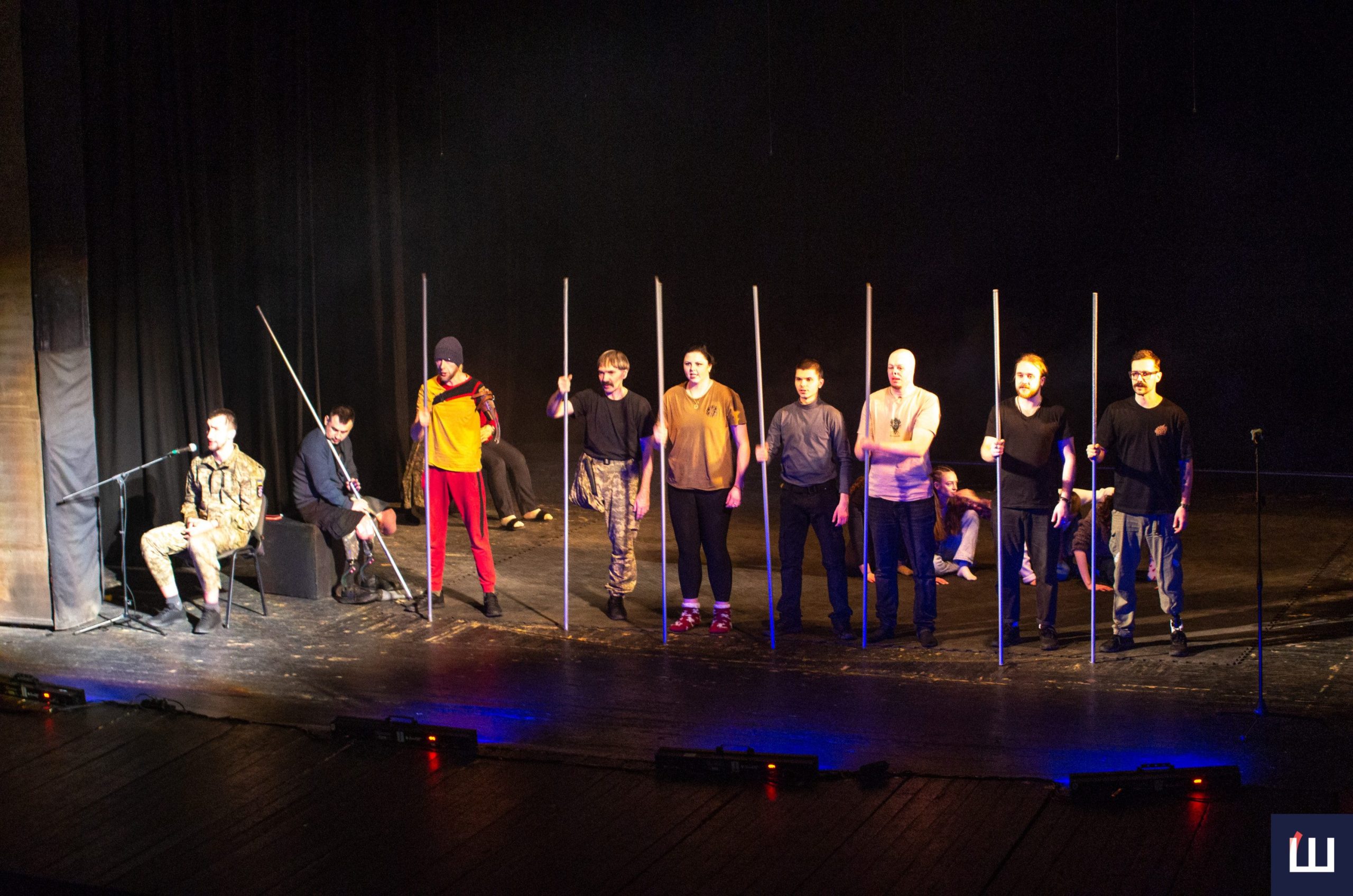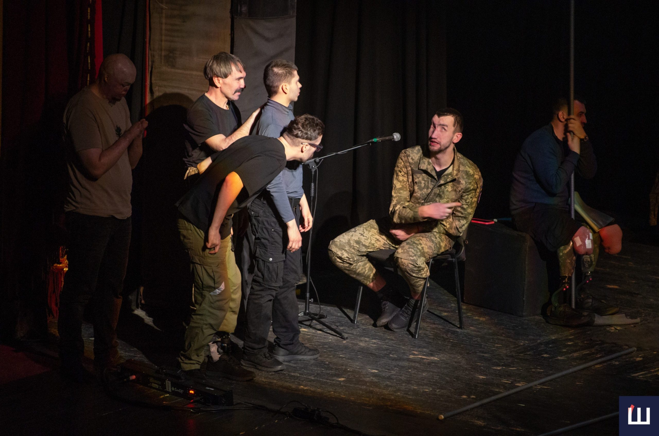 На сцені — чинні військовослужбовці та ветерани російсько-української війни. Дехто з них — на протезах, із важкими пораненнями, але з тією внутрішньою силою, яку складно передати словами. Вони не грають війну — вони її прожили.